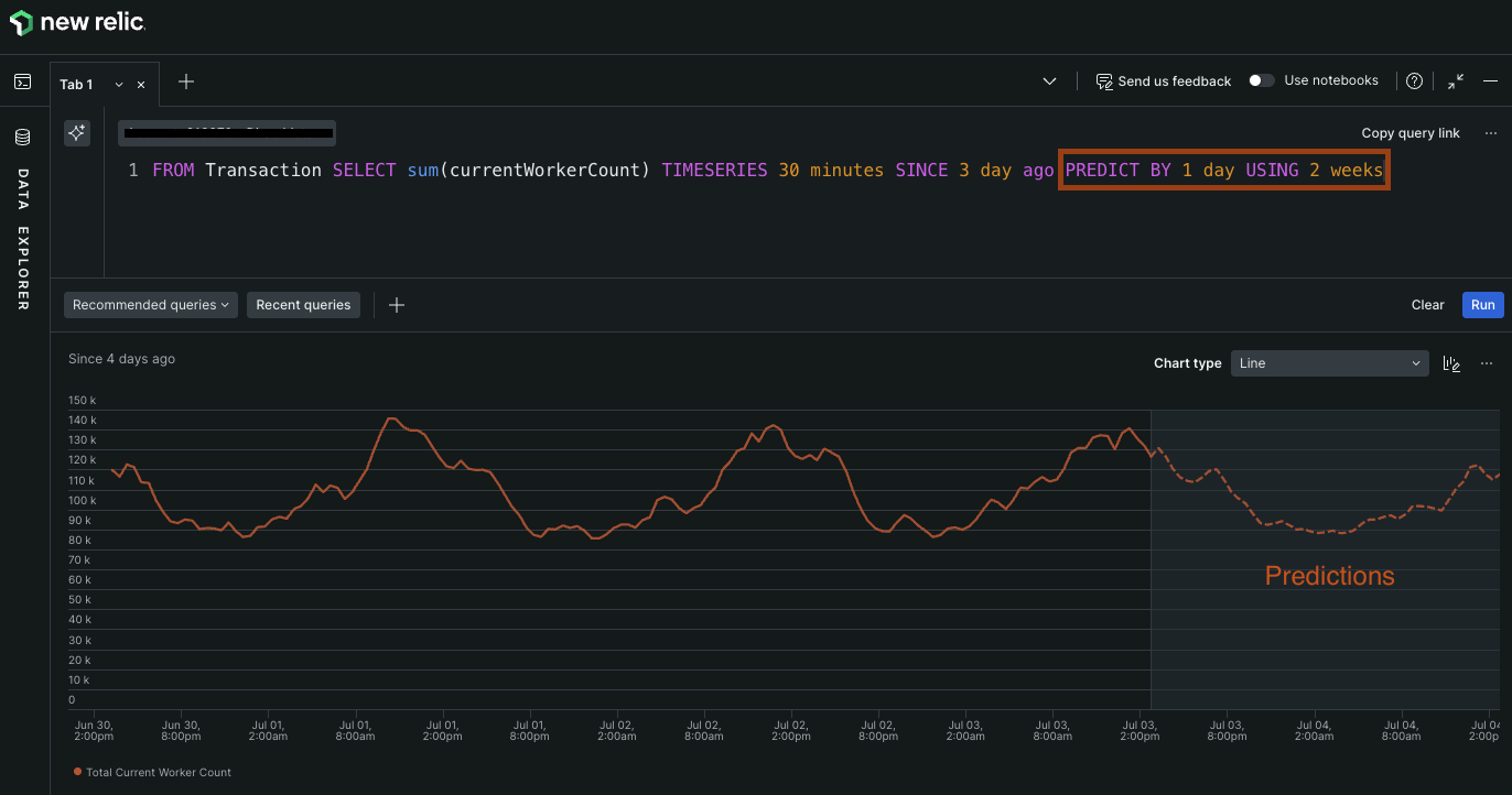 NRQL predictions can be generated in two ways: either directly on charts you have already created or by writing a NRQL query using the PREDICT clause.