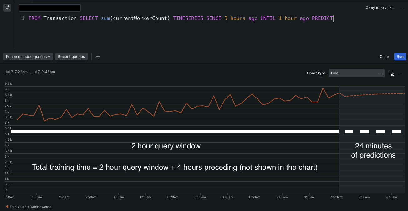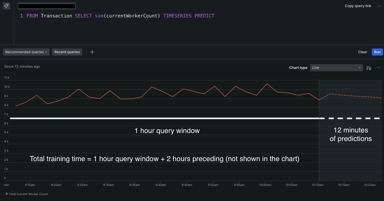 Uses historical data from the last three query windows (the current one and the two preceding it). For example, if your query window is one hour in length, a total of three hours will be used for training. The chart displays only the data from the current query window, not the entire training data.