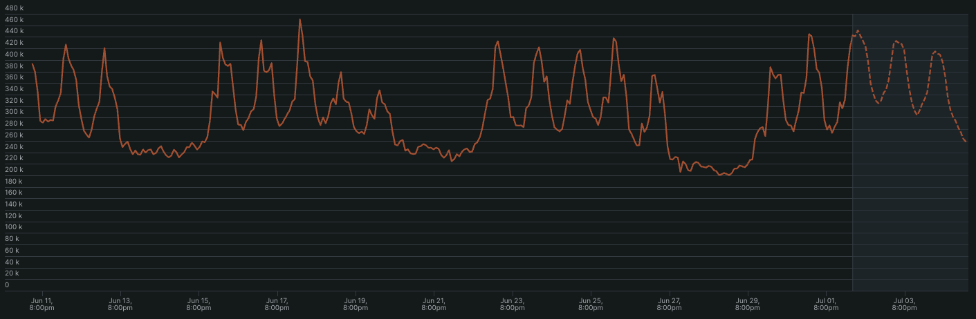 Predictions generated using NRQL predictions for a time series with weekly seasonality.