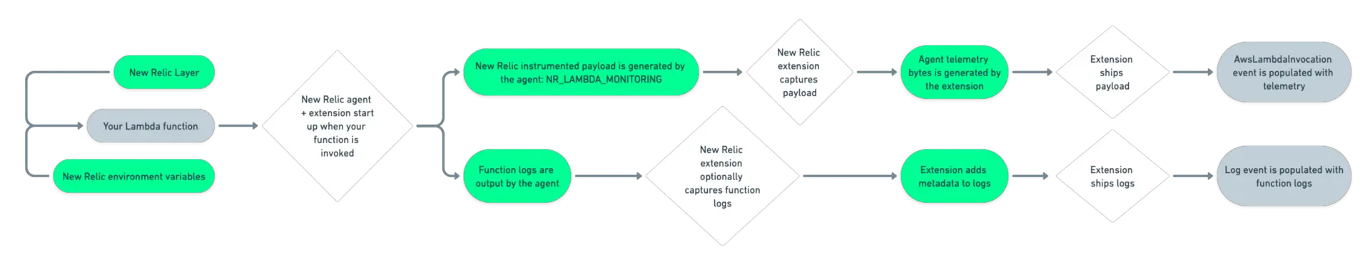 Regardless of the method you choose, the New Relic layer adds the New Relic agent to your functions. This agent automatically instruments your functions upon invocation, generating a payload, NR_LAMBDA_MONITORING, that is sent to New Relic via the New Relic Lambda extension.