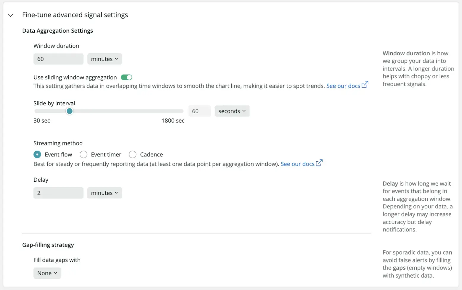 Set the window duration to the evaluation period. Following the previous example, you would set 60 minutes, meaning the alert system would aggregate 60 minutes of data.