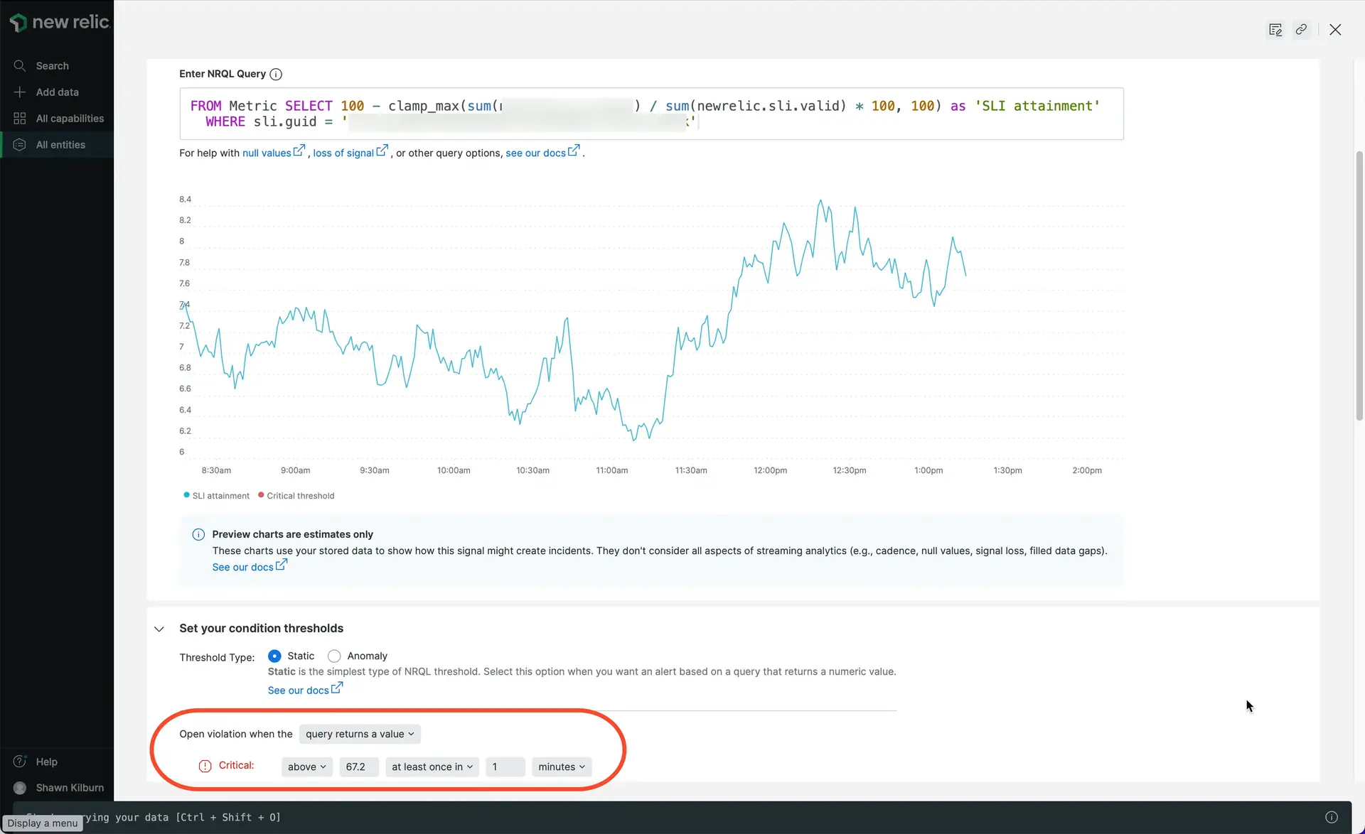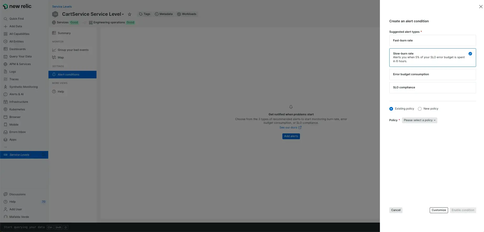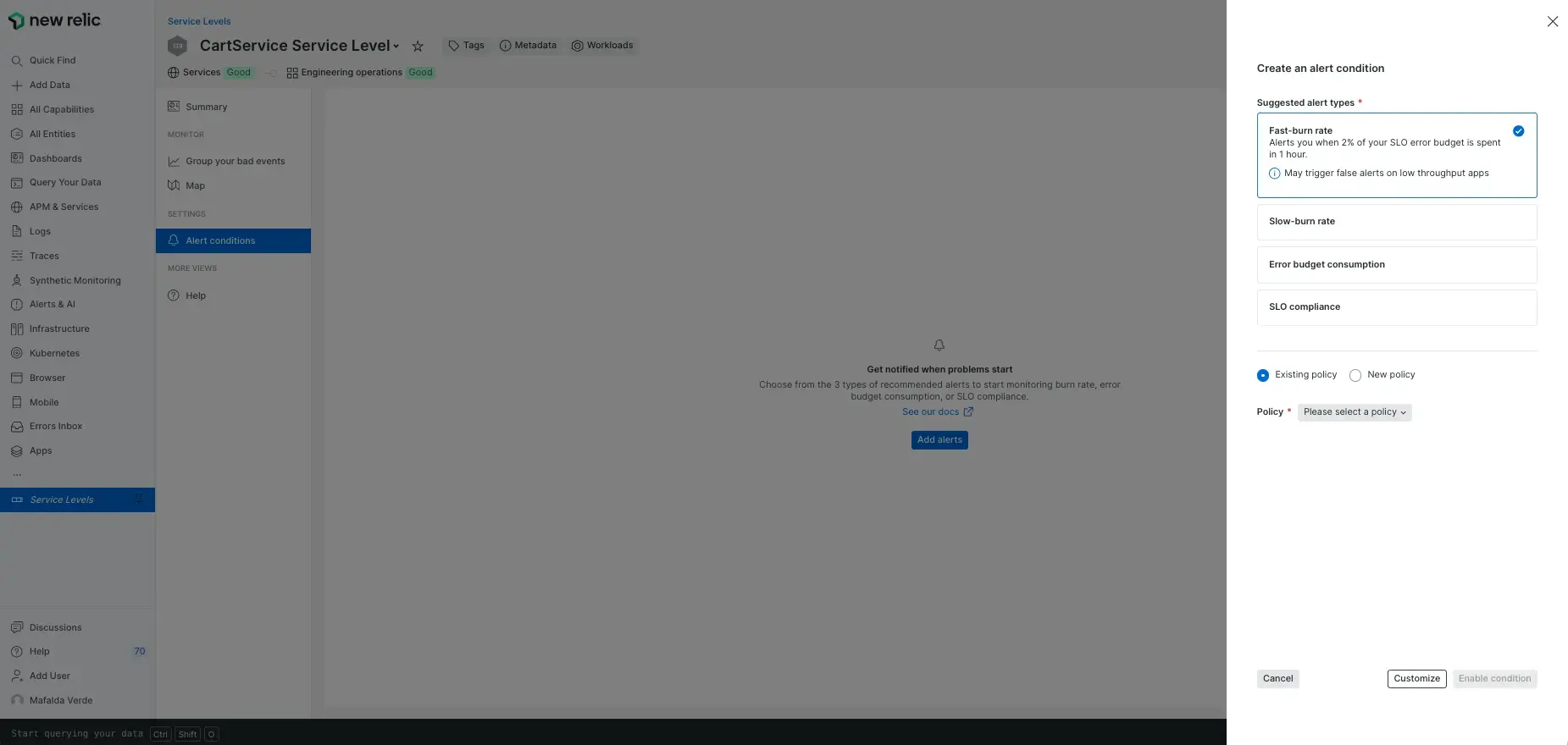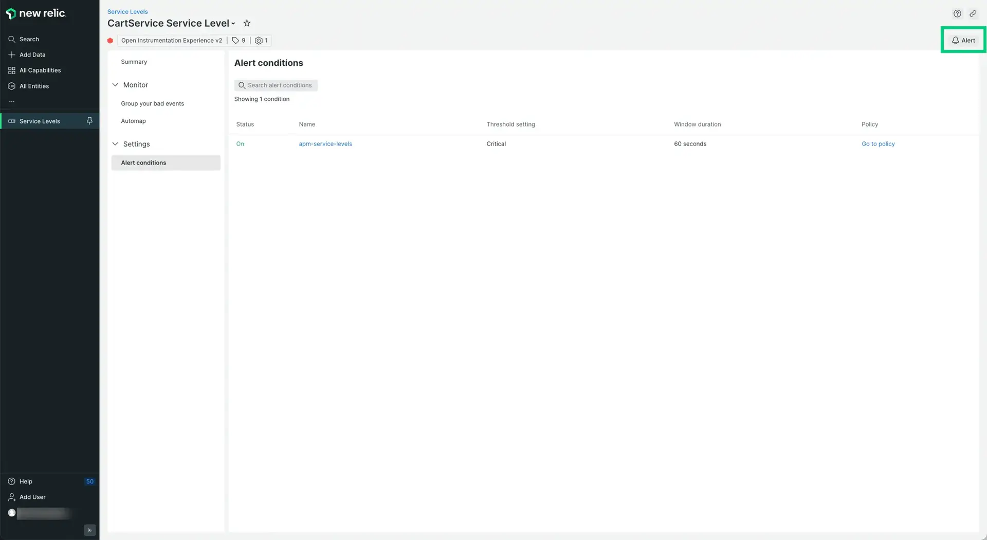 Go to one.newrelic.com > All capabilities > Service Levels > Choose a service level and then click Alert conditions under the Settings option. Click the Alert button to open the side panel.