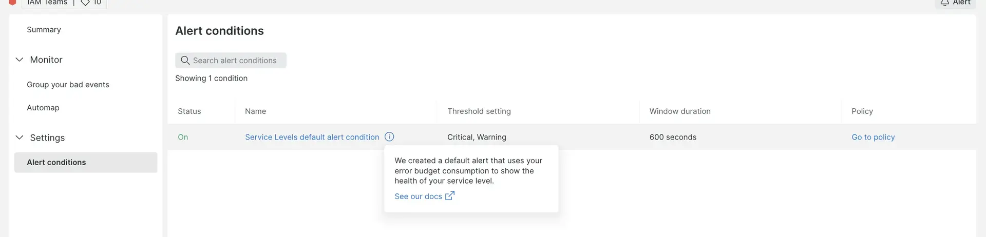 This alert policy will not trigger any notifications, and in case you prefer not to have the entity health based on its error budget consumption, you can easily delete this policy. Although, deleting the policy is permanent, and it will affect existing and new service levels for that account.