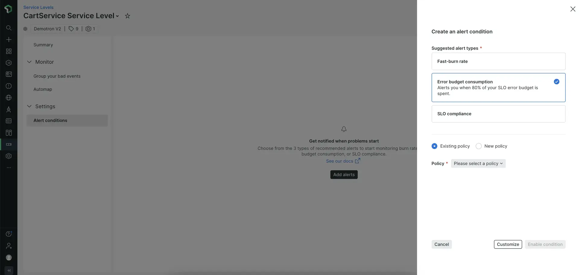 To set it up, click Alert on the service level summary or alert conditions pages, and select the Error budget consumption option.