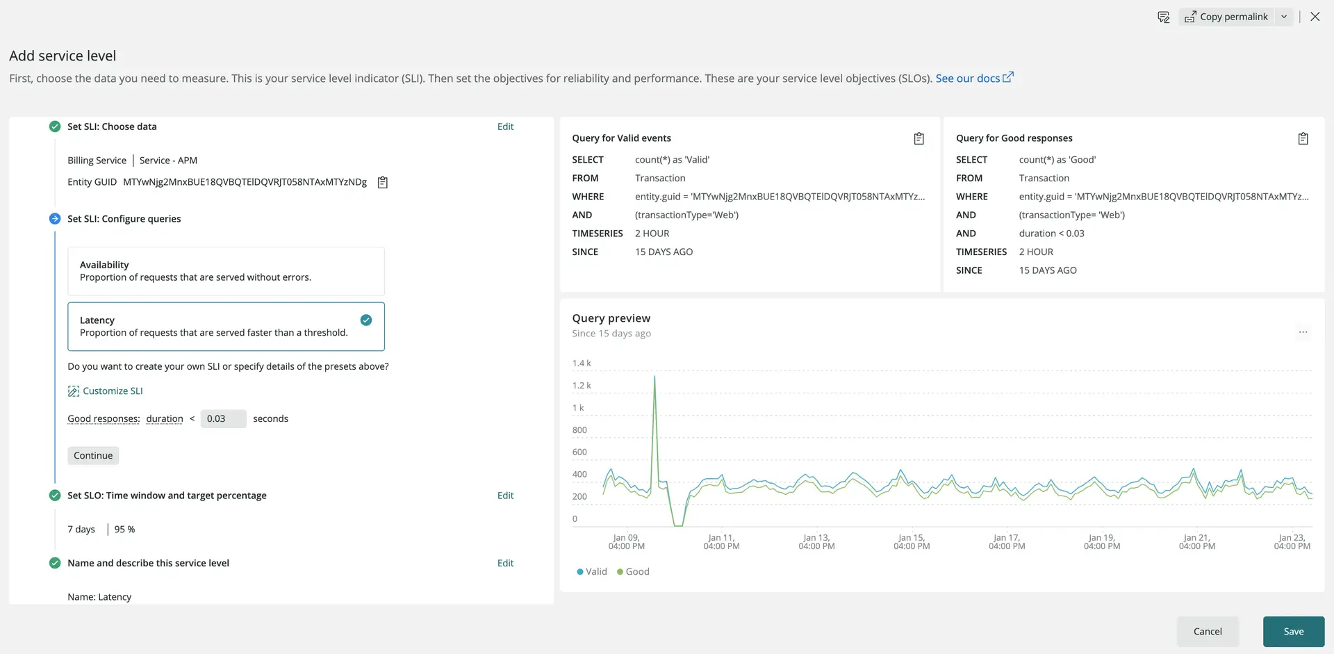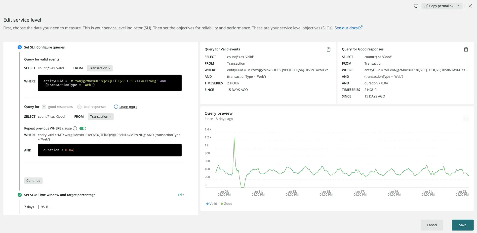 If you're using a different type of entity, you want to query dimensional metrics, or you want to customize the baseline values provided by New Relic, you can customize the SLI to your needs. For instance, you can use the WHERE clause to filter out health checks. You could also use different event types on each queries; in this case, make sure that each valid event corresponds only to one or less events on the good or bad query.