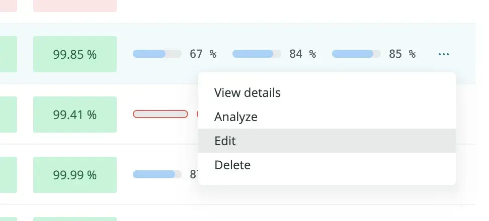 Once you've created an SLI, you can edit it through the service levels list page, by clicking on the ... menu and then Edit, as shown here: