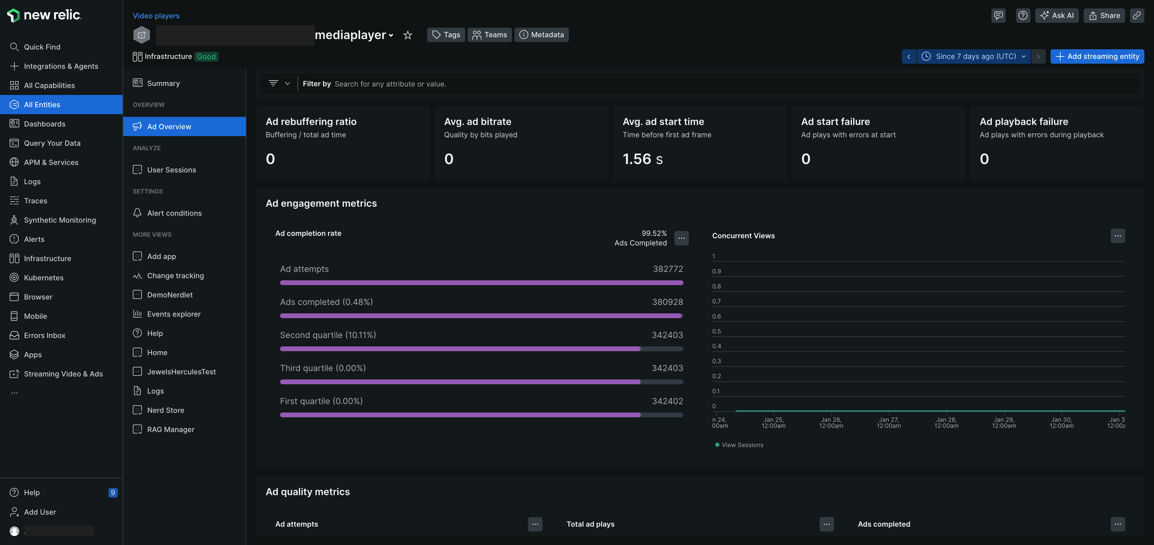 To view the ad overview page of the video agent across all platforms, go to one.newrelic.com > All Capabilities > Streaming Video & Ads > Ad Overview.