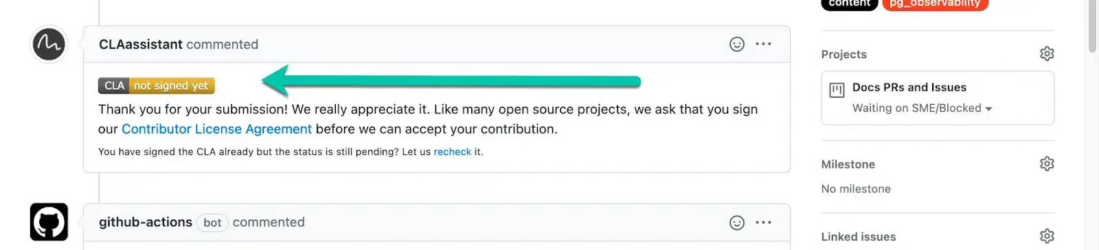 If you haven't already signed the CLA (contributor license agreement), you get a prompt in the pull request reminding you to sign it. Make sure you sign this to ensure the PR is accepted: