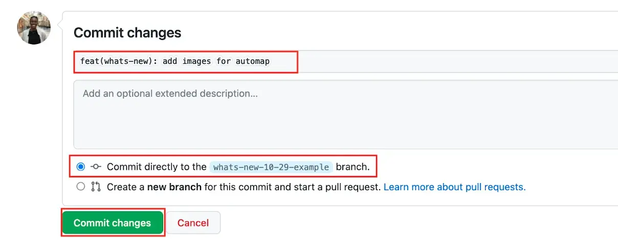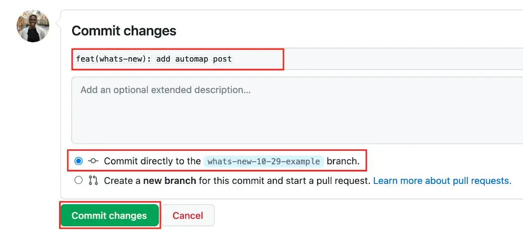 feat(whats-new): describe your post in a few words. This format tells us you're adding a post about a feature (feat). Here are some examples:feat(whats-new): add automap postorfeat(whats-new): apm.Select the option to Commit directly to the [name of your branch] branch, and then click Commit changes.