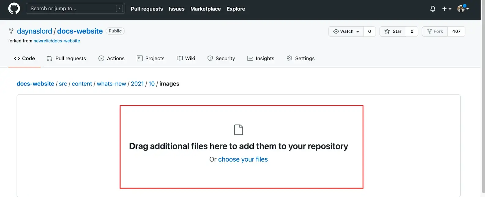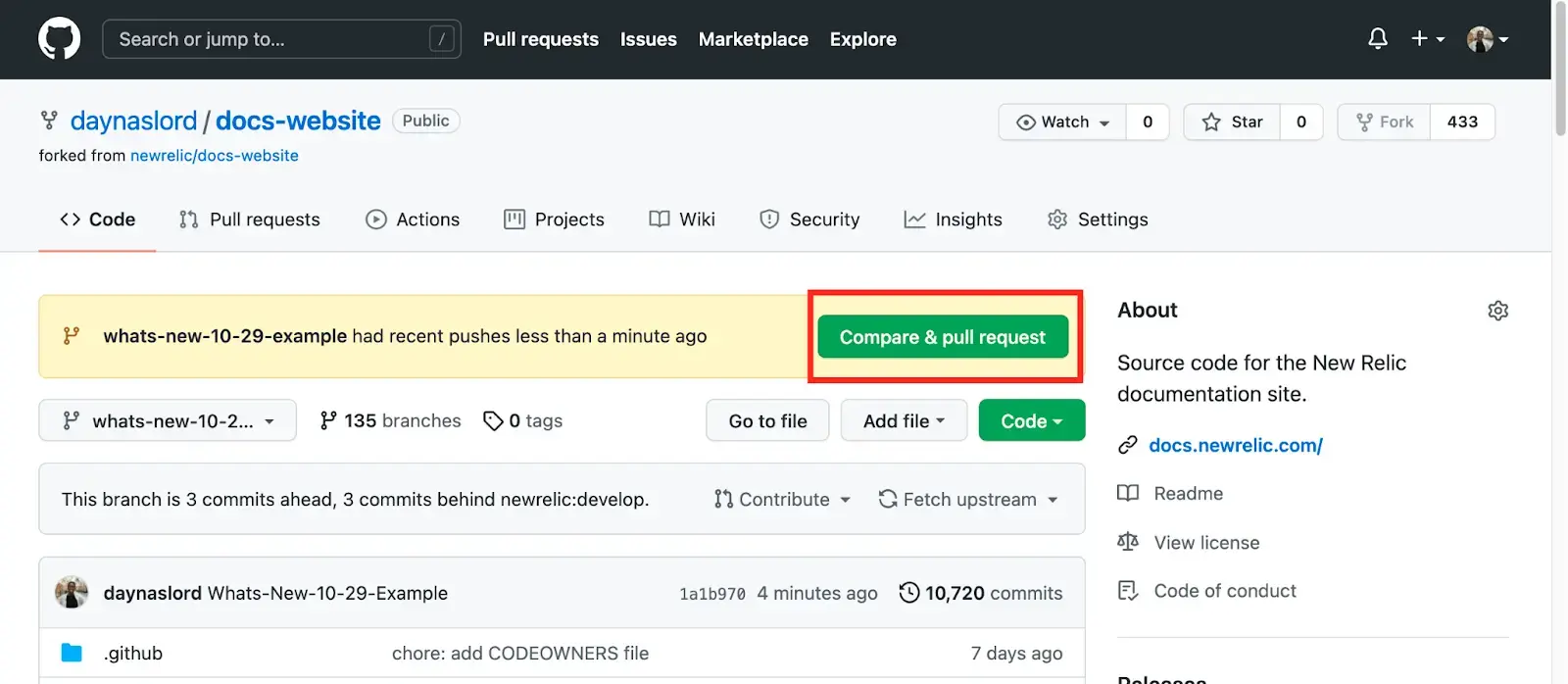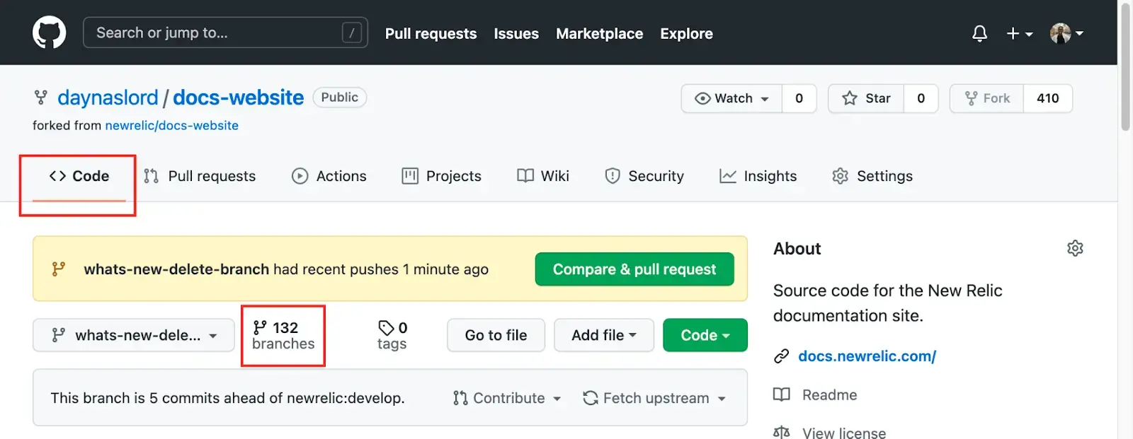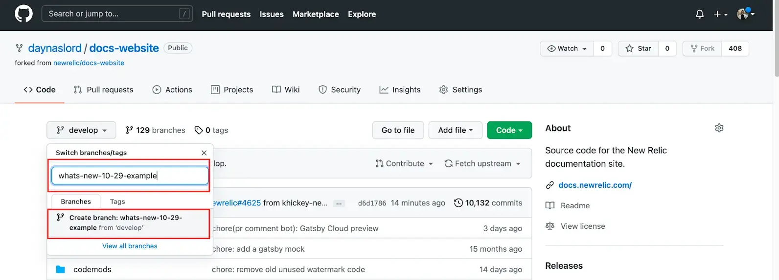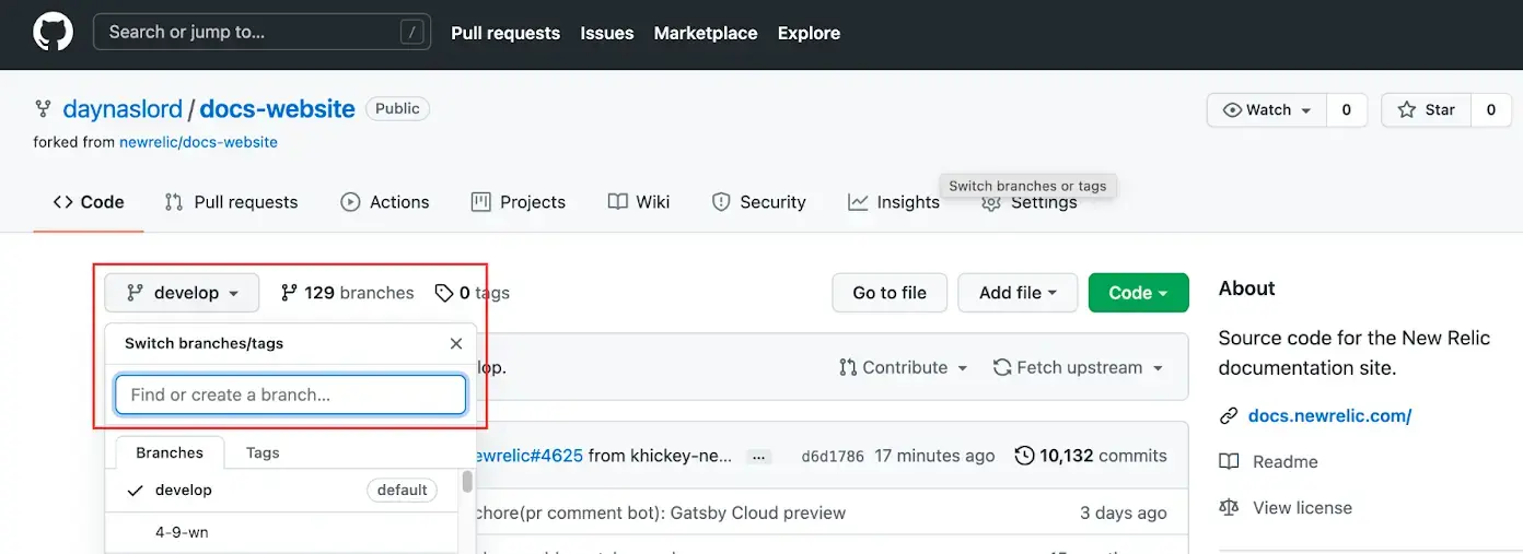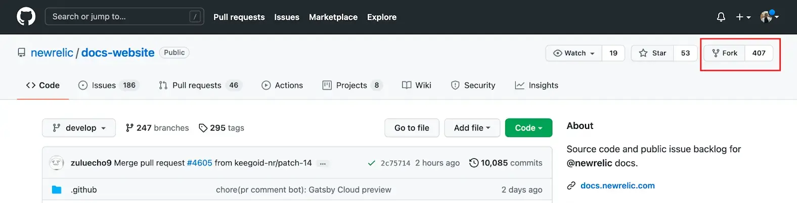 Go to https://github.com/newrelic/docs-website, and if you haven't forked the site yet, click Fork. Skip to step 2 if you've already forked the docs site.