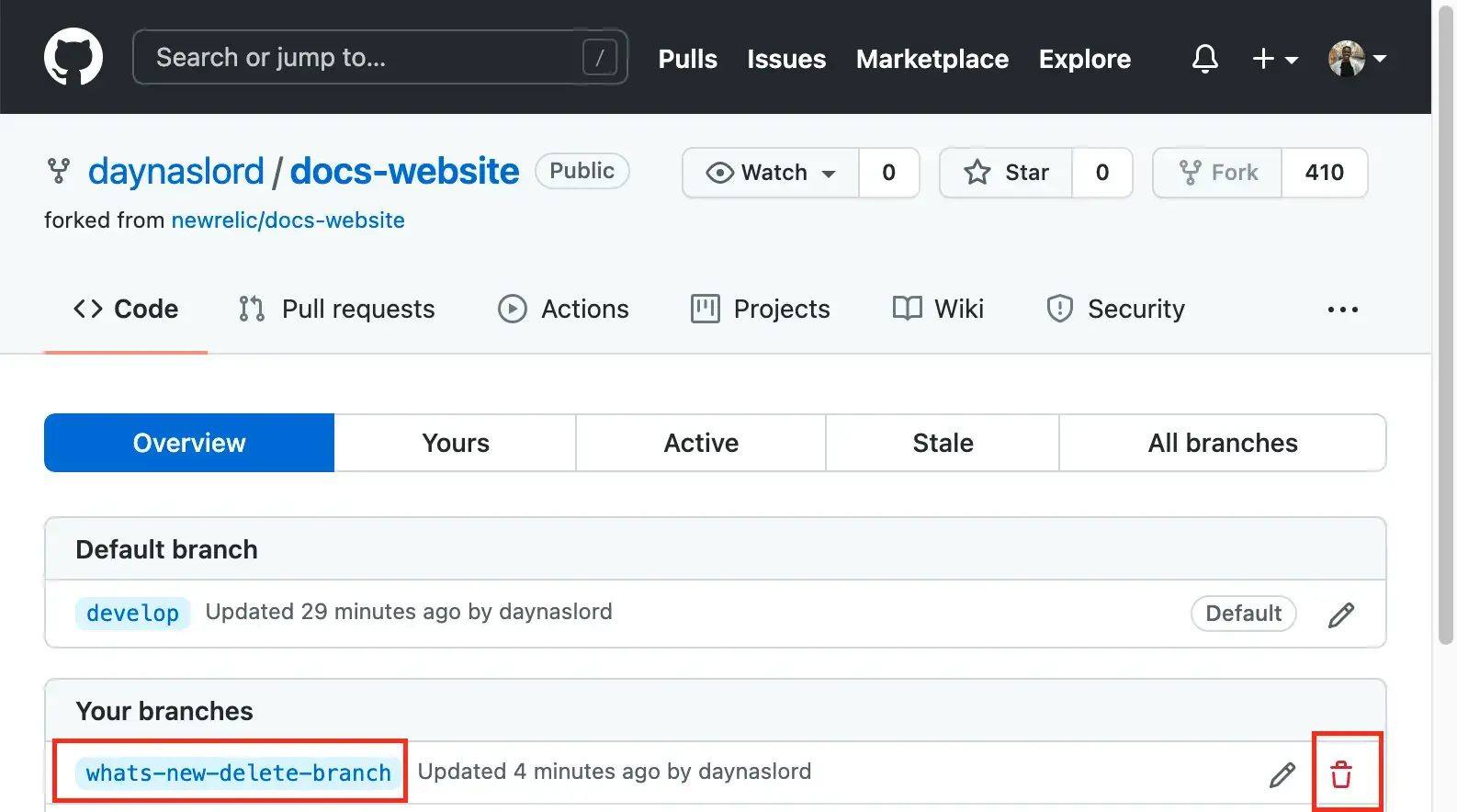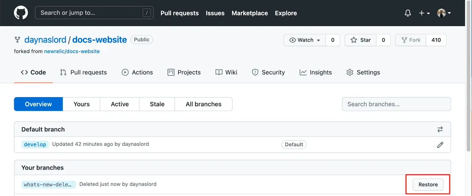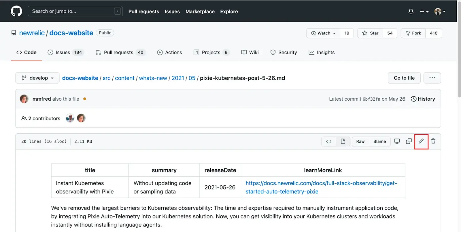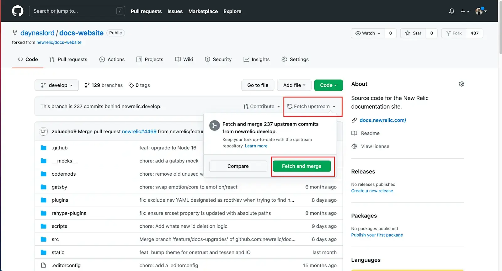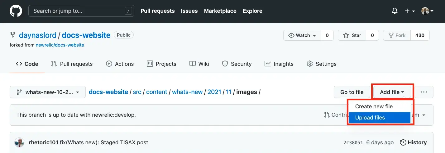 Go to https://github.com/newrelic/docs-website, and if you haven't forked the site yet, click Fork. Skip to step 2 if you've already forked the docs site.
