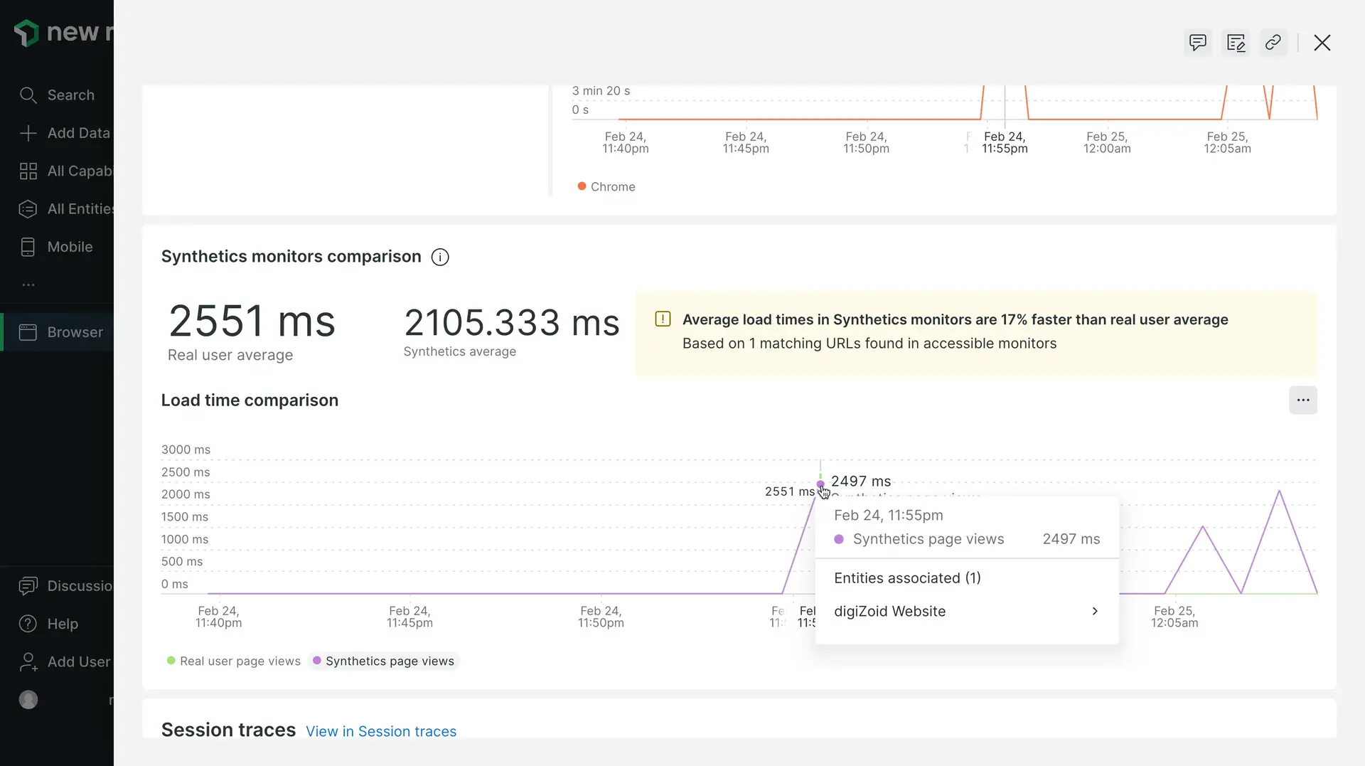 - Comparisons of synthetic trends vs. actual browser performance without needing to switch between our monitoring capabilities.