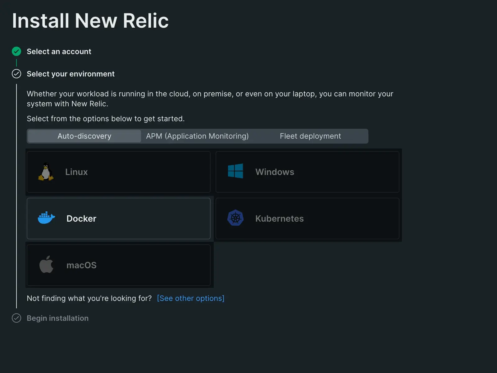 An image displaying New Relic's guided installation for Docker