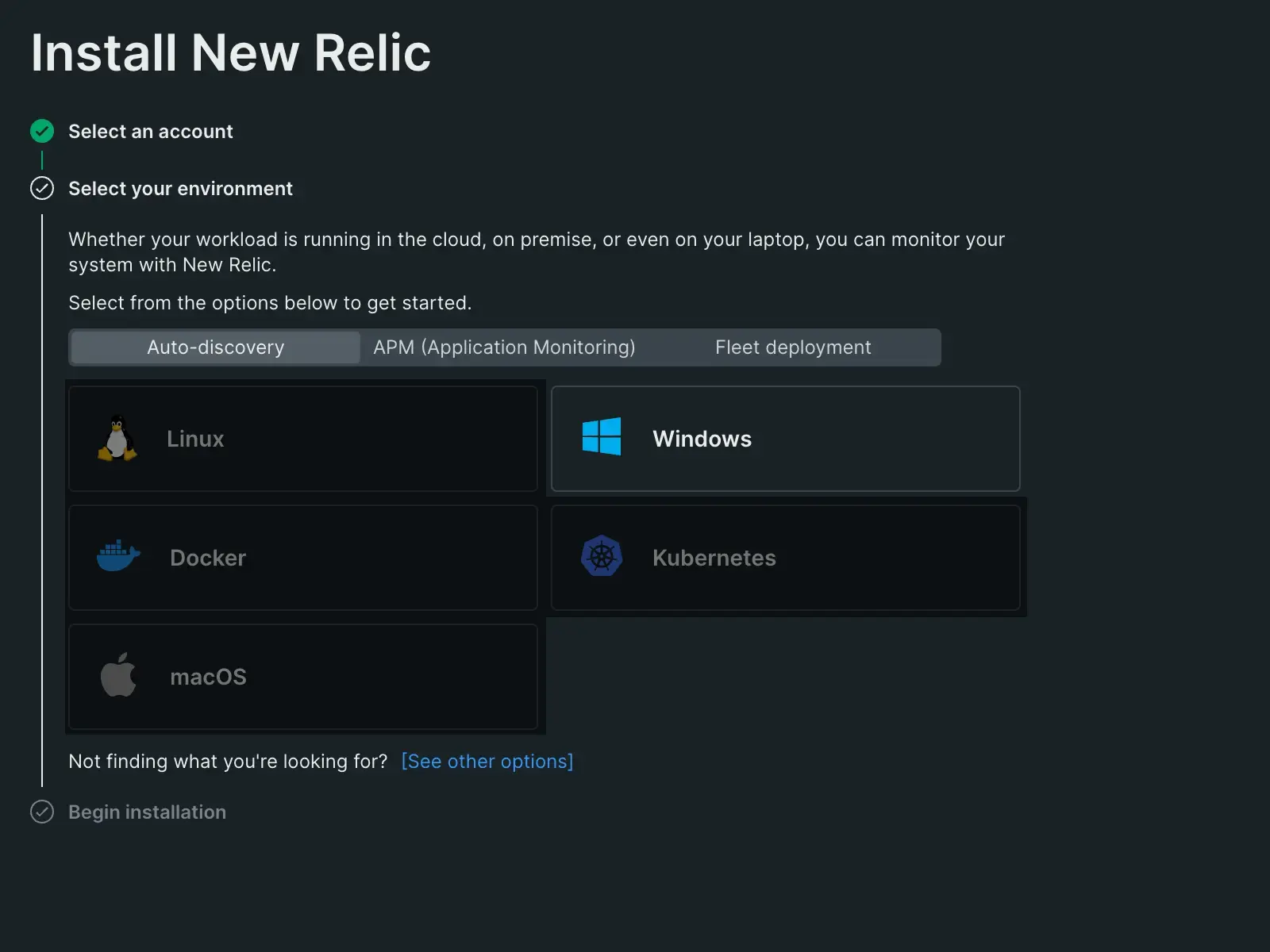 An image displaying New Relic's guided installation for Windows