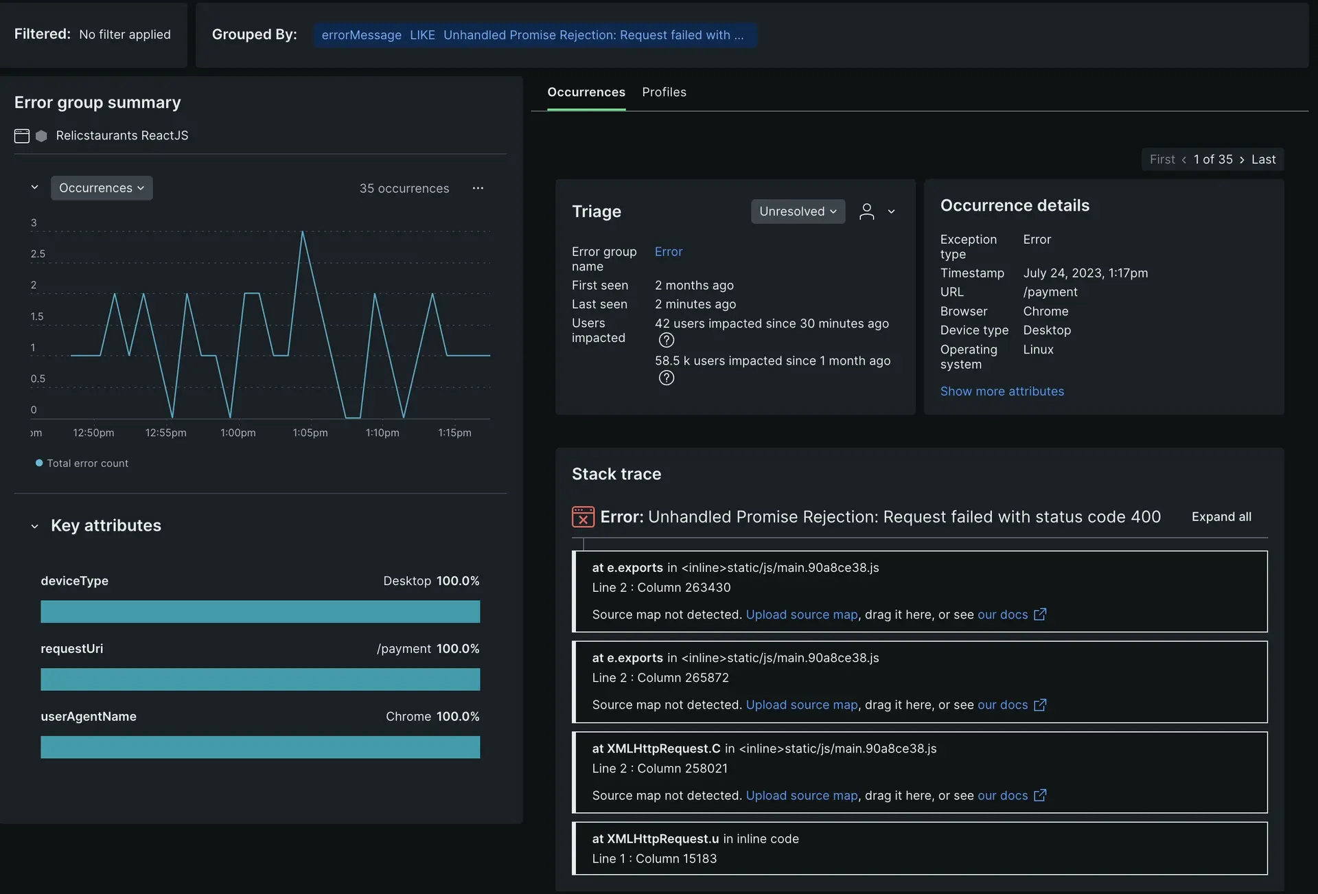 Once you've chosen an error, select it from the JS errors page. From here, you can open different views to investigate a specific error: