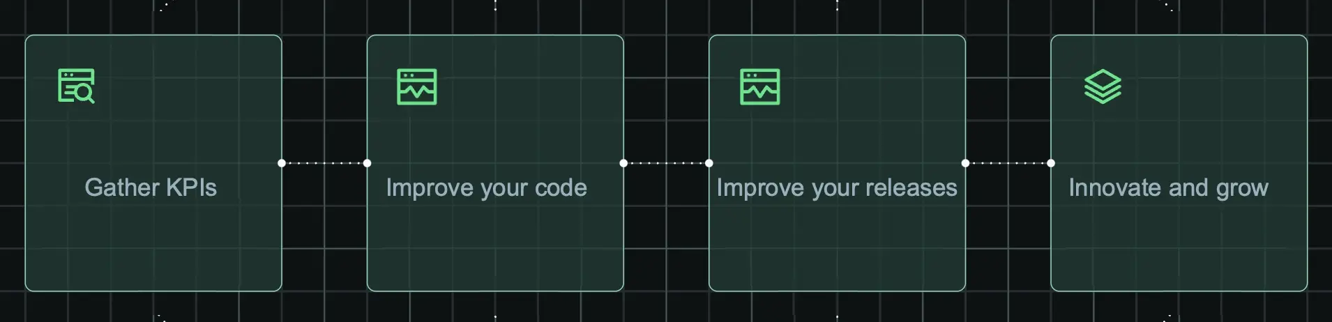 A diagram showing the four parts of improving your development and release quality with New Relic: gather KPIs, improve your development quality, improve your release quality, innovate and grow