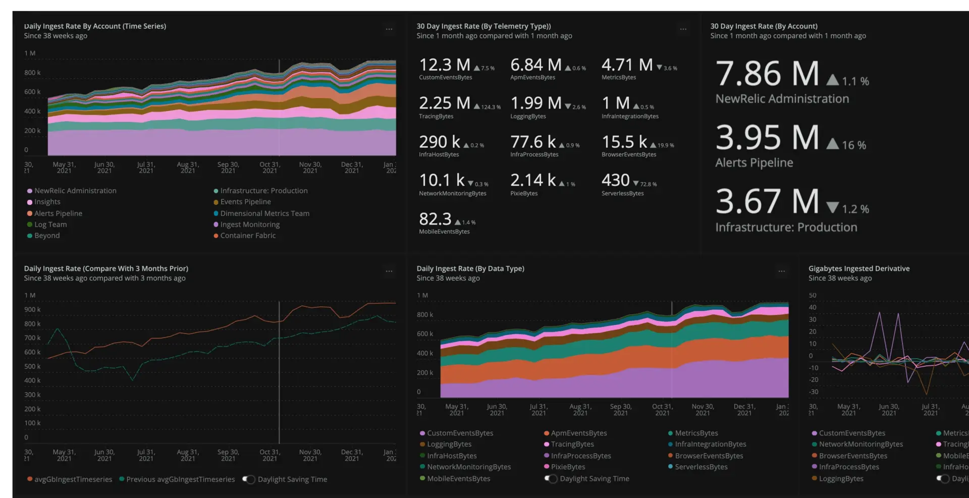 SELECT sum(GigabytesIngested) AS 'gb_ingest_30_day_sum', rate(sum(GigabytesIngested), 1 day) AS 'gb_ingest_daily_rate', derivative(GigabytesIngested, 90 day) as 'gb_ingest_90_day_derivative' FROM NrConsumption WHERE productLine='DataPlatform' since 30 days ago facet consumingAccountName, usageMetric limit max