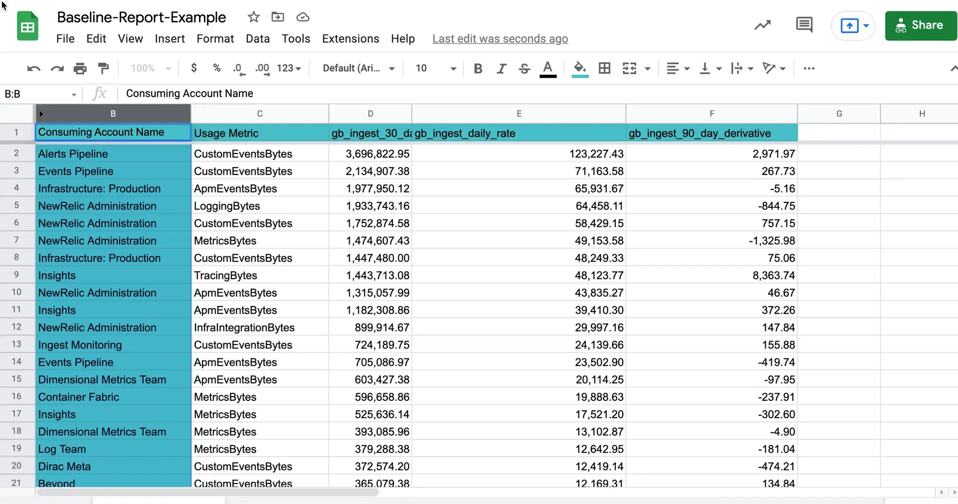 Once you've installed the baseline dashboard and changed the data it reports to suit your needs, you can generate a tabular report of your ingest data after enough time has passed for you to gather the appropriate amount of data you. You can do this from the Baseline report, and the most common timespan is 30 days. To generate the report: