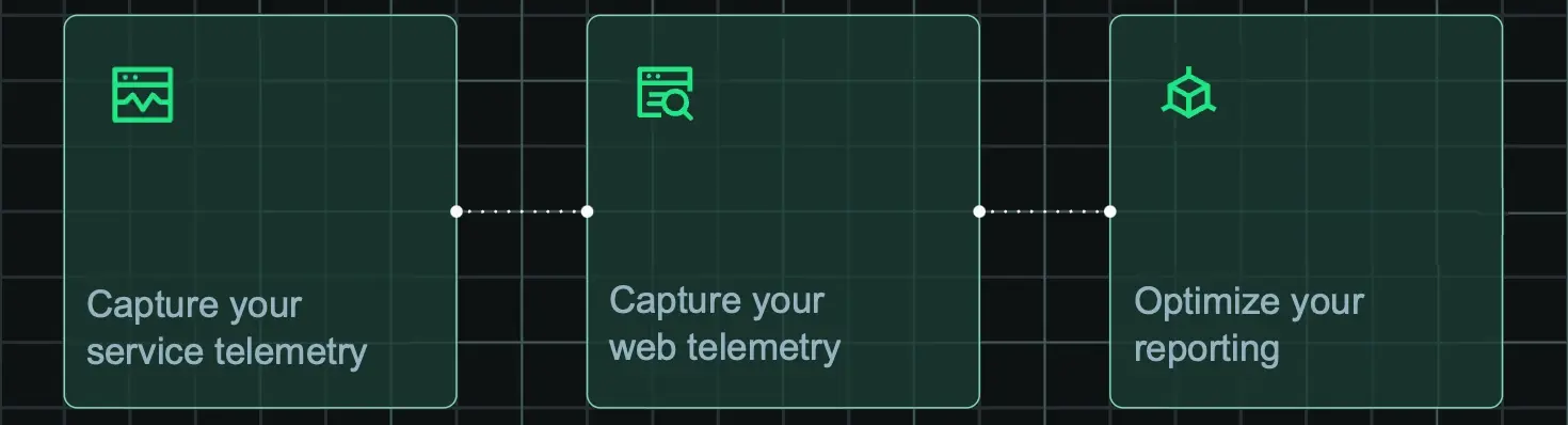 A diagram displaying the path for capturing relevant data with New Relic. The path is 1. Capture your service telemetry, 2. capture your web telemetry, and 3. optimize your reporting
