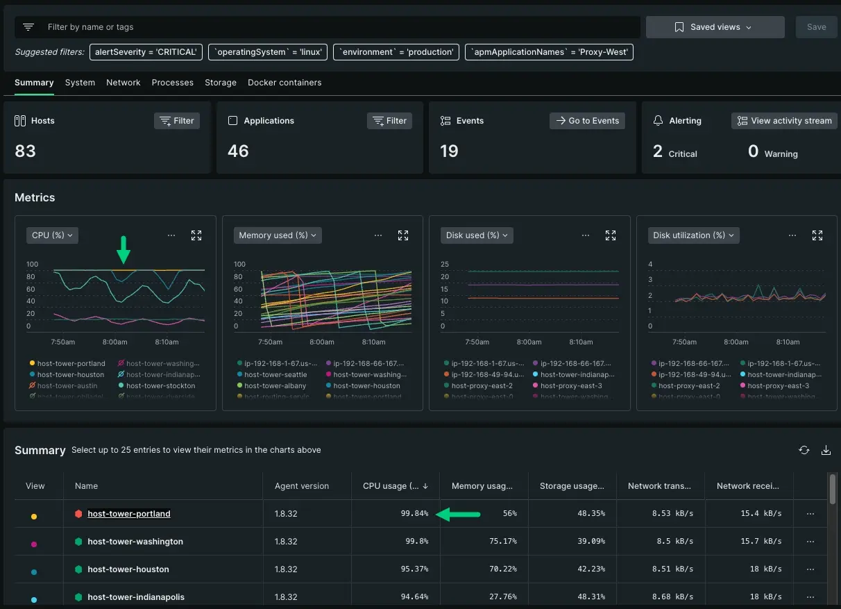 host-tower-portlandhas a critical alert event.From the summary table, you can see that the CPU is running hot at 99.84%.