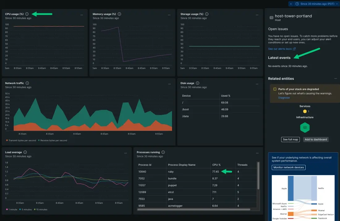 After clicking on a host, a new summary page appears with data specific to that host. At this stage, you're trying to elaborate on patterns identified from the summary page. Let's see if we can correlate CPU percentage with any other data specific to host-tower-portland.