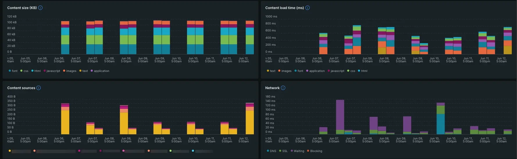 Once data has been collected, you'll be able to view different charts that track user details about your page's assets. Taken together, they can help you understand how your users experience your site.