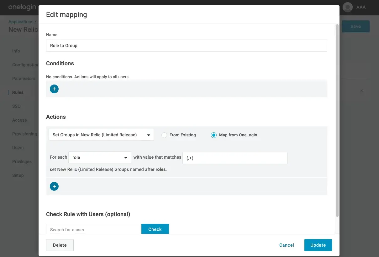 Note that at the moment, there is no way to delete a group from the OneLogin side. This is a known limitation from OneLogin. Removing or changing rules does not delete groups already sent to New Relic. If you wish to no longer use a group, removing all the users from the group will prevent it from being used at New Relic.