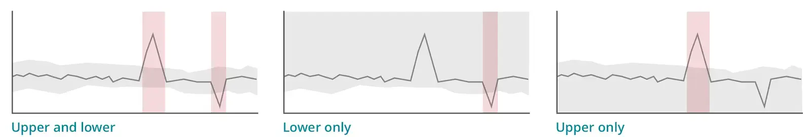 Here are examples of how large fluctuations in your data would be treated under the different anomaly direction settings. The red areas represent alert events.
