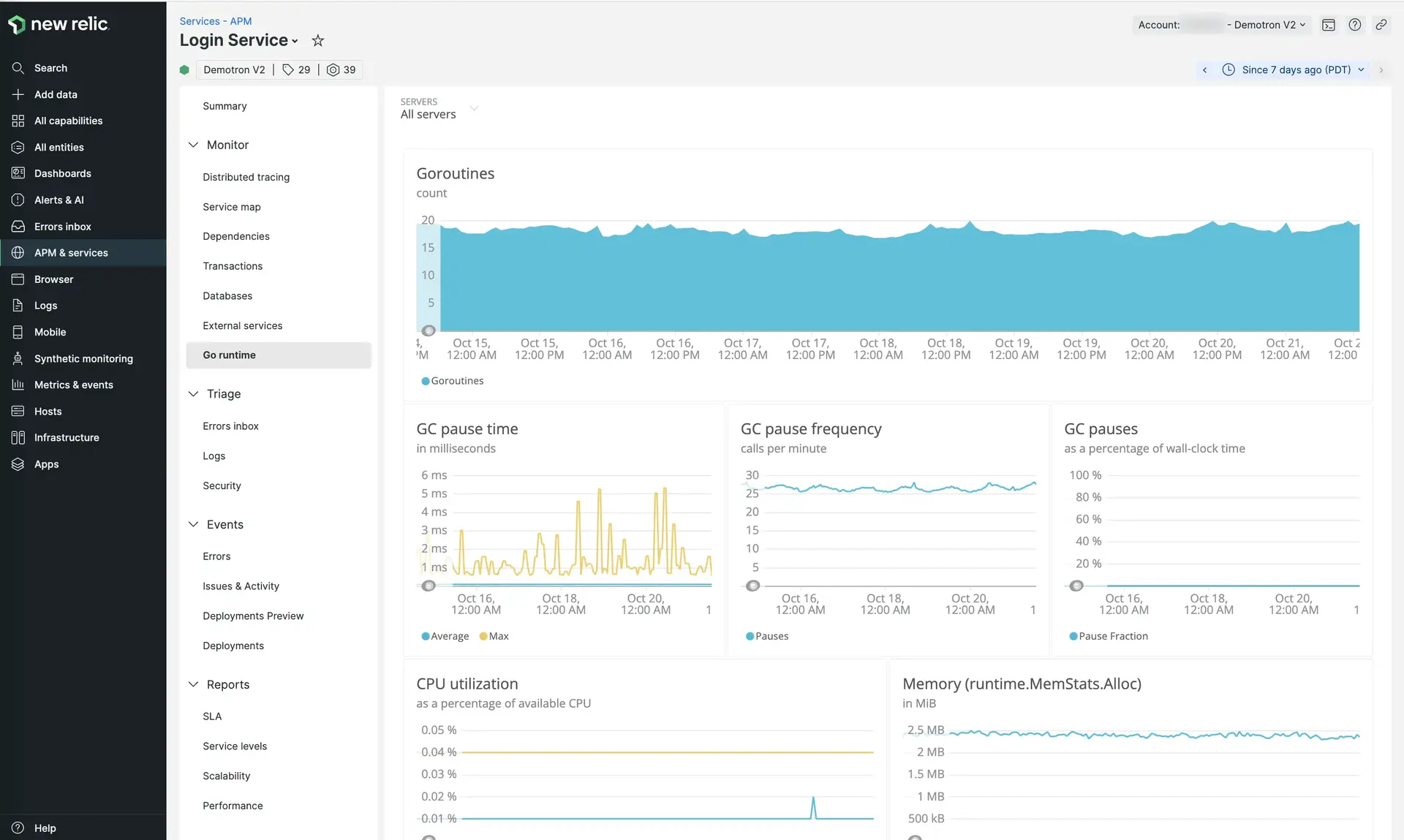 Pour afficher la page Go runtime, accédez à one.newrelic.com > All capabilities > APM & services > (select an app) > Go runtime.