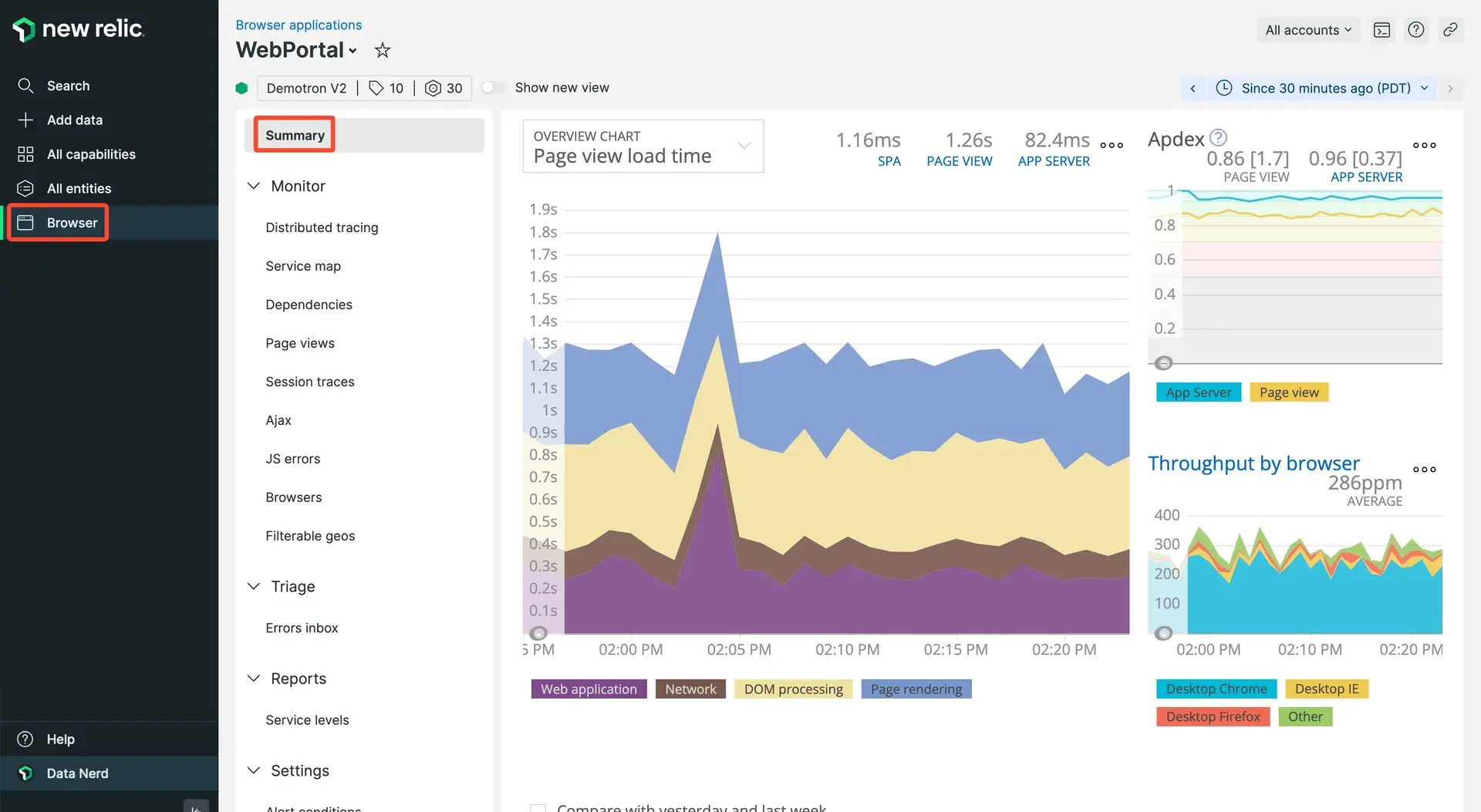 one.newrelic.com > All capabilities > Browser > (select an app) > Summary:Le graphique du temps de chargement apparaît sur les pages Summary et Page views .