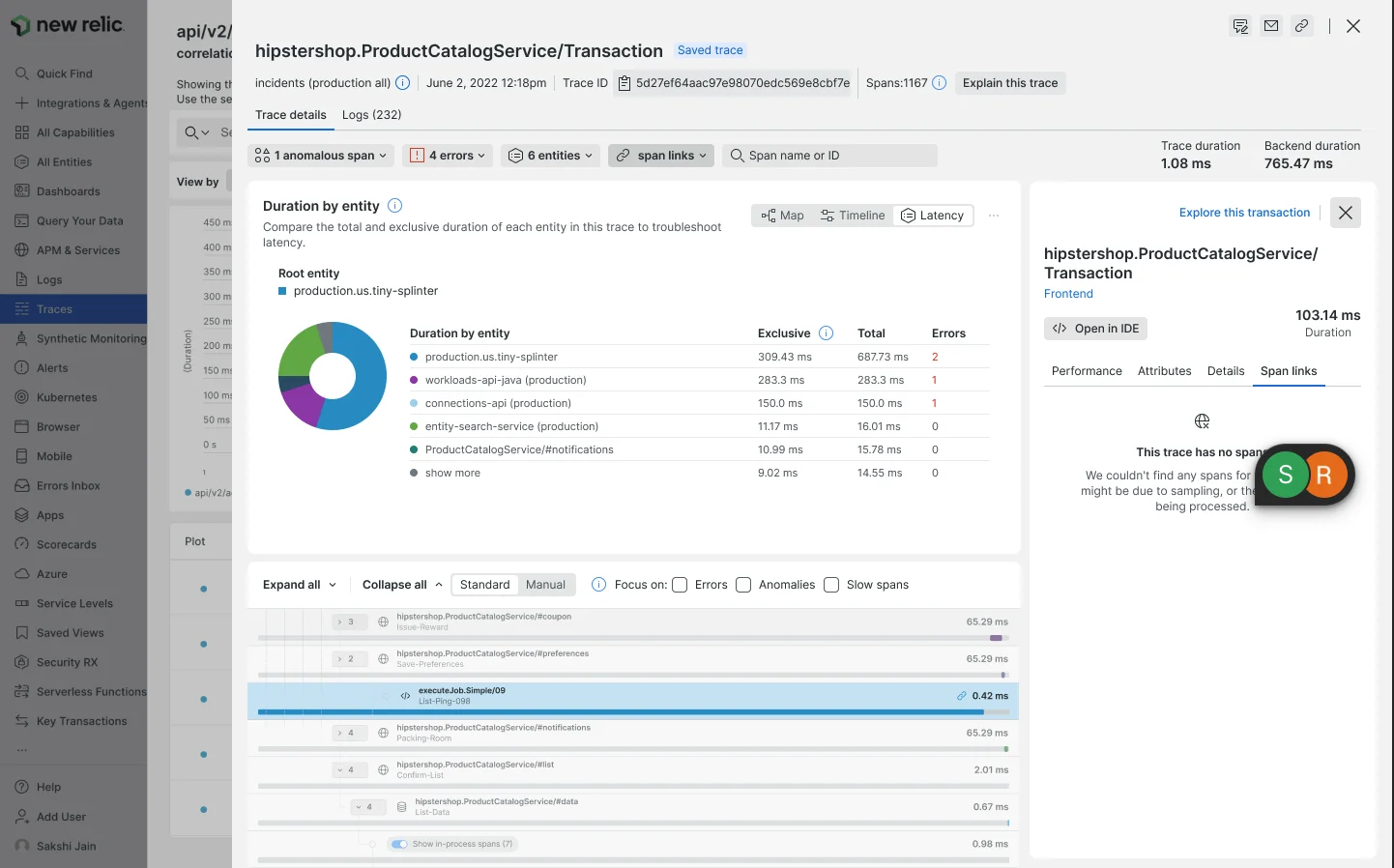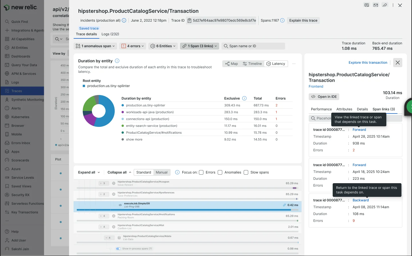 Dans le volet des détails du span, cliquez sur l'onglet Span links.