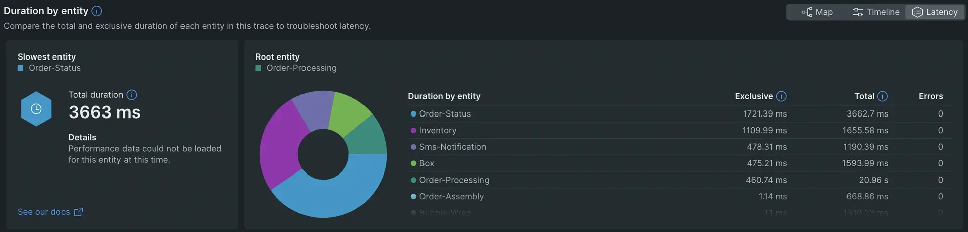 La vue de latence vous montre le niveau de latence apporté par chaque entité de la trace, ainsi que le nombre d'erreurs par entité. La latence apportée par une entité est le temps pendant lequel un ou plusieurs processus étaient en cours d'exécution mais n'effectuaient aucun appel externe ou de base de données. Voici deux exemples :