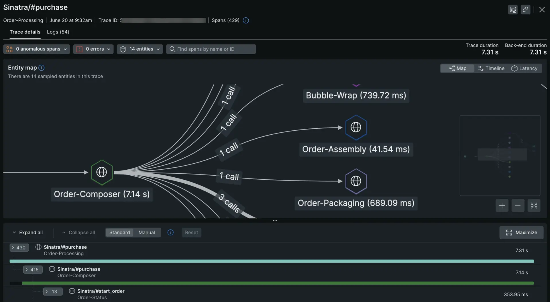 Si une entité a un processus d'une durée de 500 ms, mais qu'elle effectue un appel externe pendant 400 ms de ce temps, elle est considérée comme contribuant à 100 ms de latence à la trace.