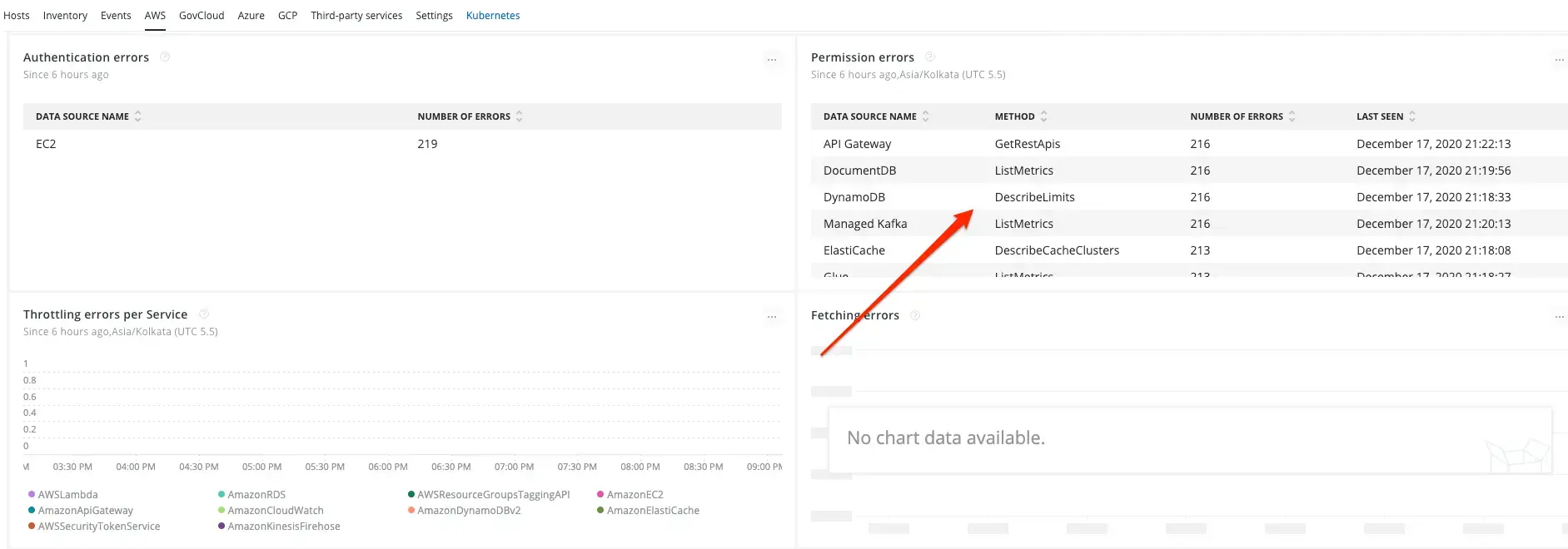 Si des erreurs sont signalées, assurez-vous que votre document de politique d'autorisations (s'il ne s'agit pas de la politique AWS Read-Only Access standard) contient les méthodes signalées dans le dashboard des erreurs conformément à notre documentation sur les autorisations personnalisées .