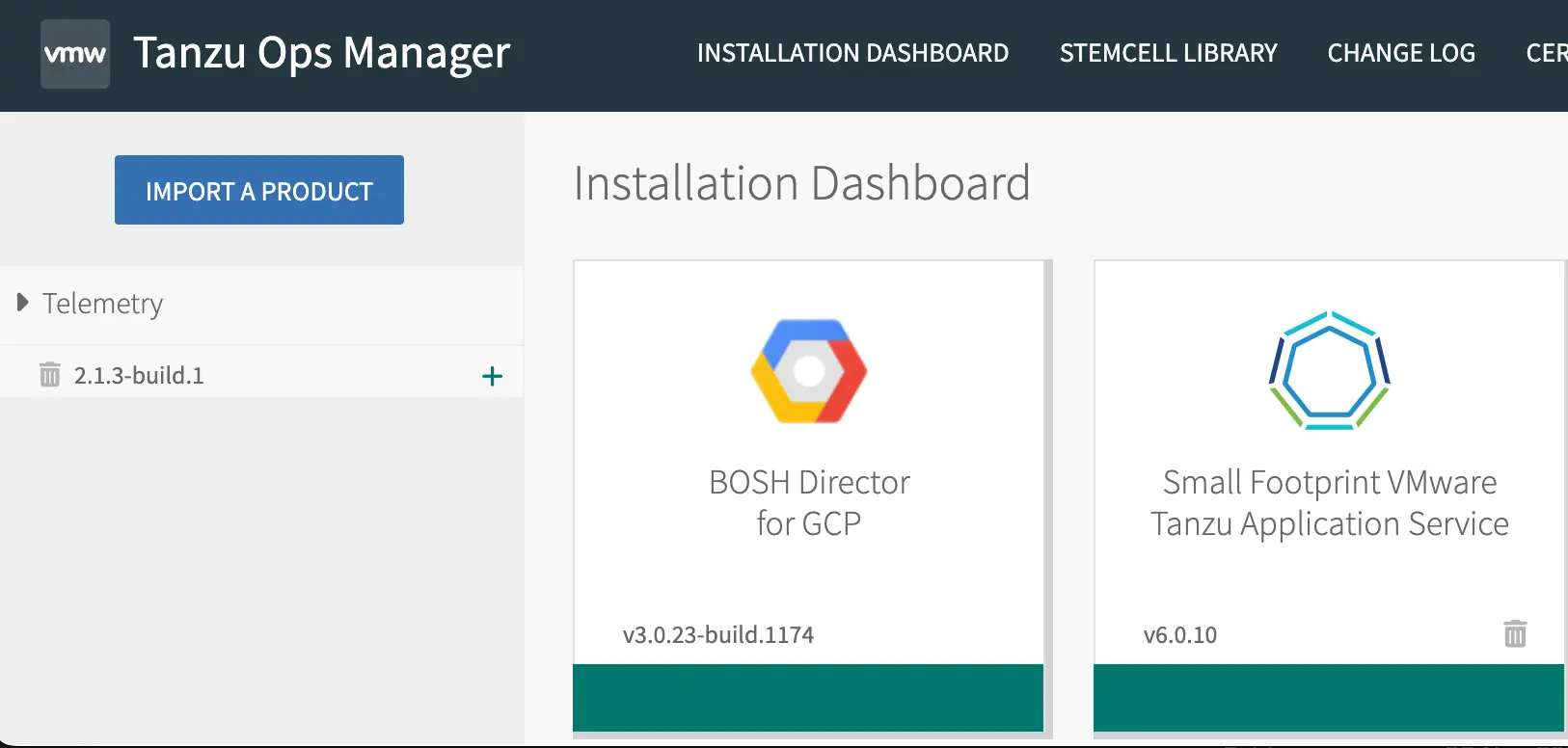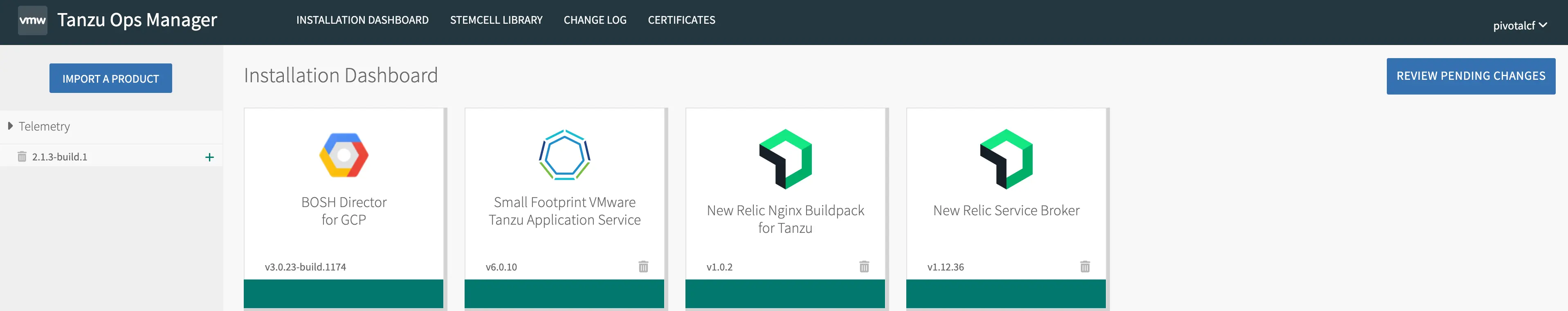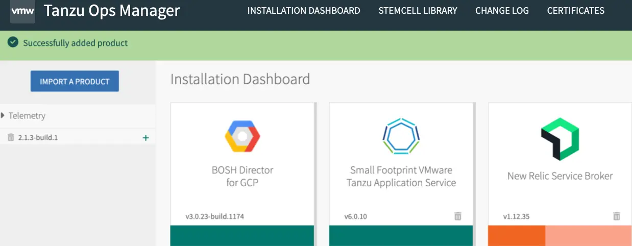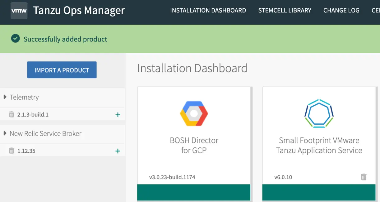 Cliquez sur Import a Product et importez la mosaïque New Relic Service Broker pour VMware Tanzu.