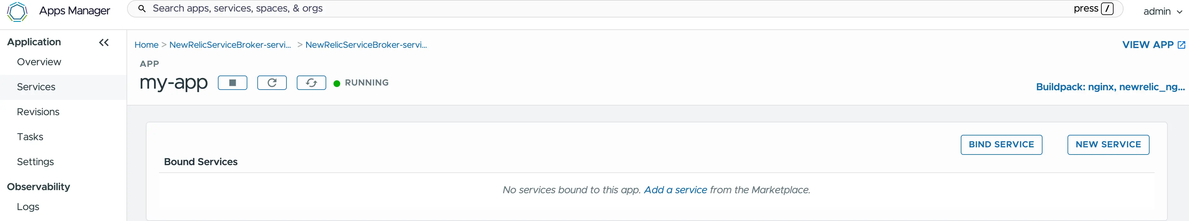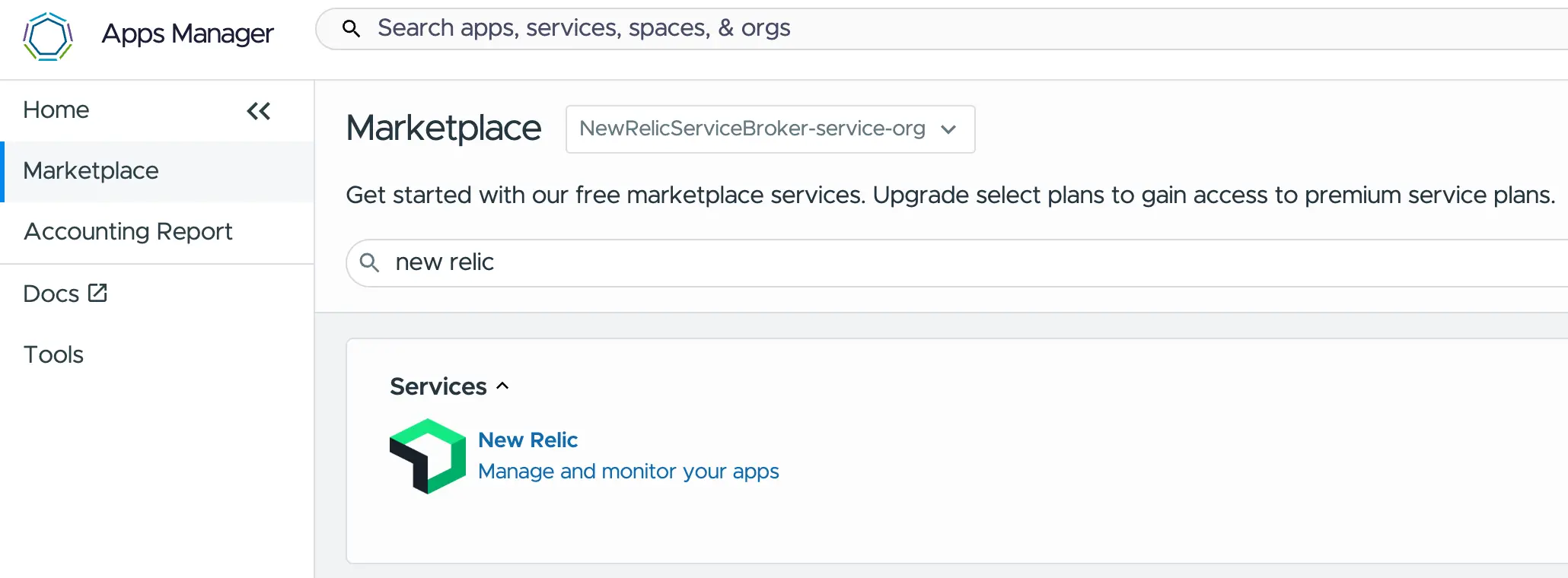 Une fois l’installation terminée, vérifiez le Marché des services dans le Gestionnaire d’applications. Sélectionnez la tuile New Relic.