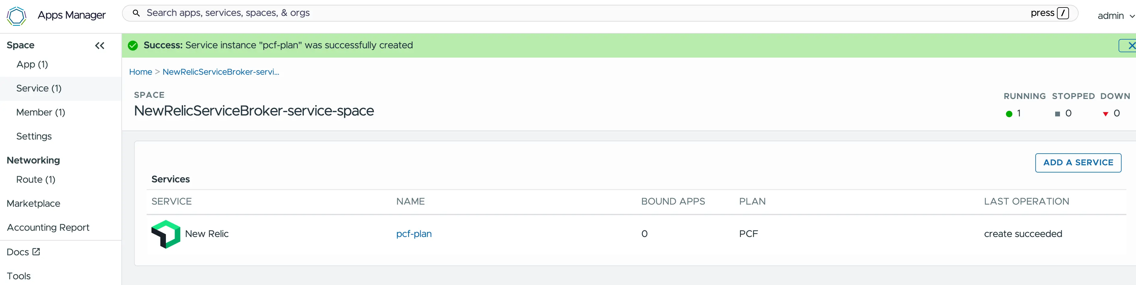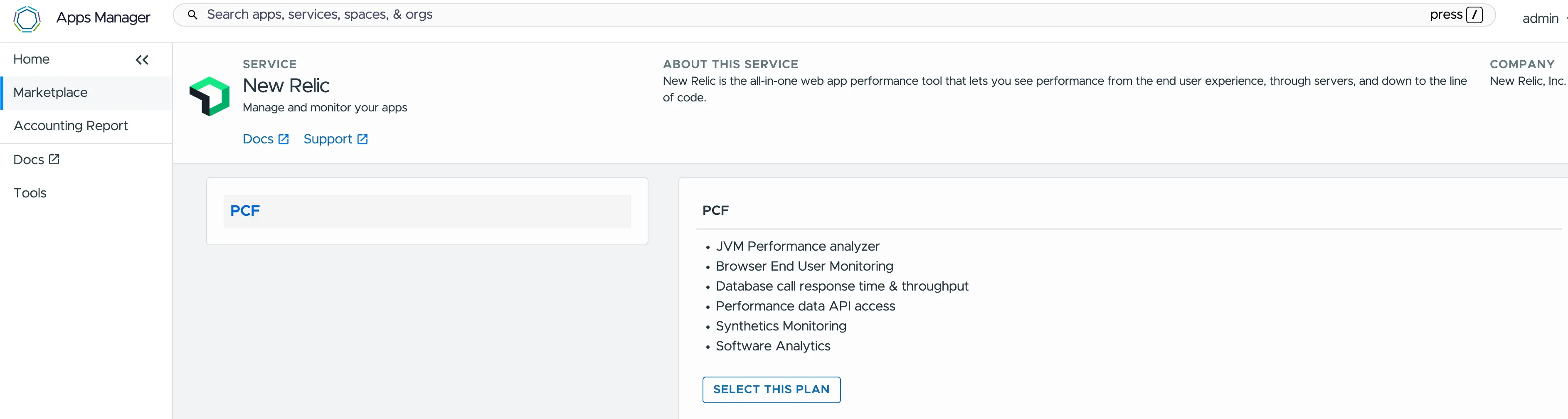 Le broker expose le service New Relic sur la Marketplace et permet à l'utilisateur de créer directement une instance de service et de la lier à ses applications soit depuis Apps Manager soit depuis la ligne de commande.