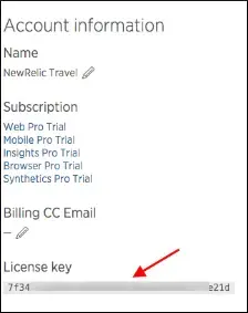 - Connectez-vous à votre compte New Relic et accédez à la page Paramètres du compte à partir du menu déroulant dans le coin supérieur droit de la page. Copiez la clé de licence de votre compte New Relic et collez-la ici.