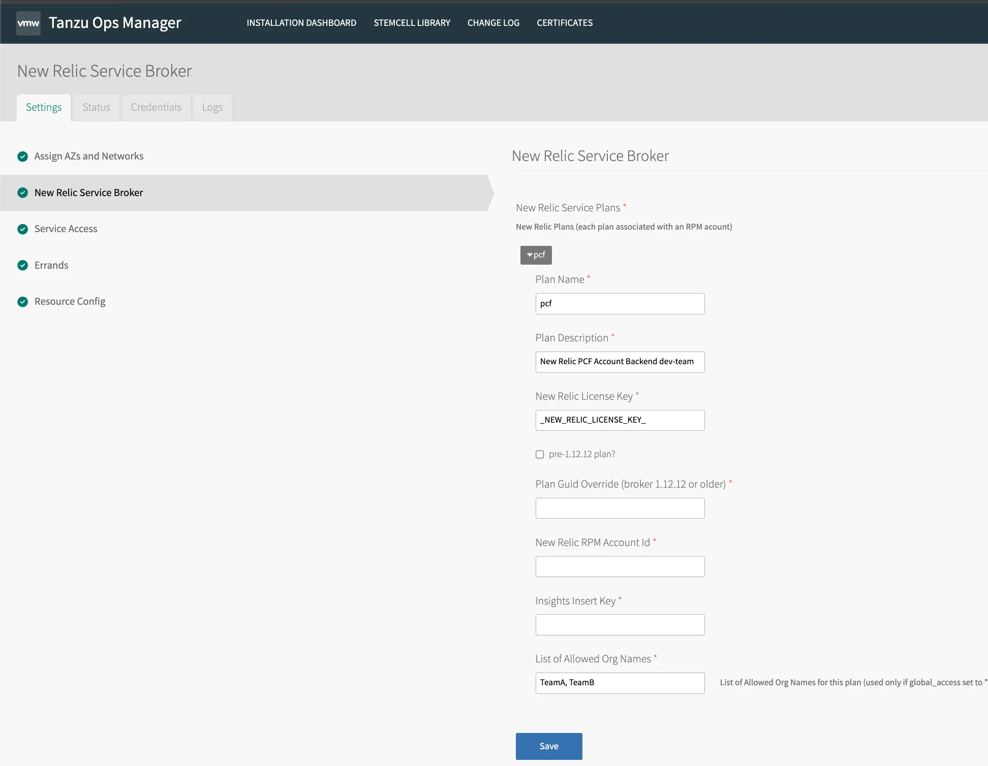 - Si vous effectuez une mise à niveau à partir de New Relic Service Broker 1.12.12 ou d'une version antérieure, assurez-vous de suivre les instructions de la section de mise à niveau de ce document pour cocher l'indicateur « plan antérieur à 1.12.12 » et saisir le GUID du plan antérieur à 1.12.12.