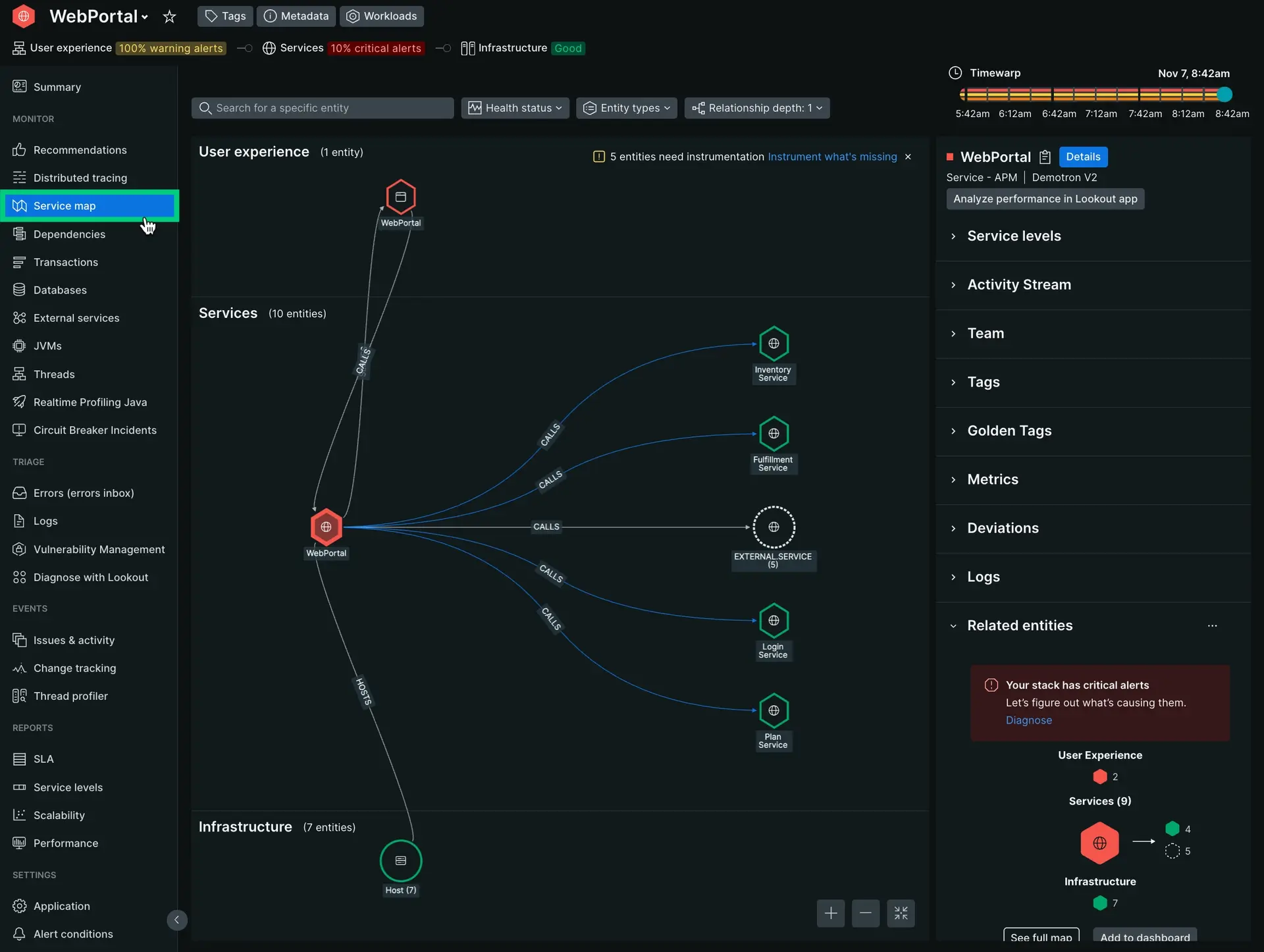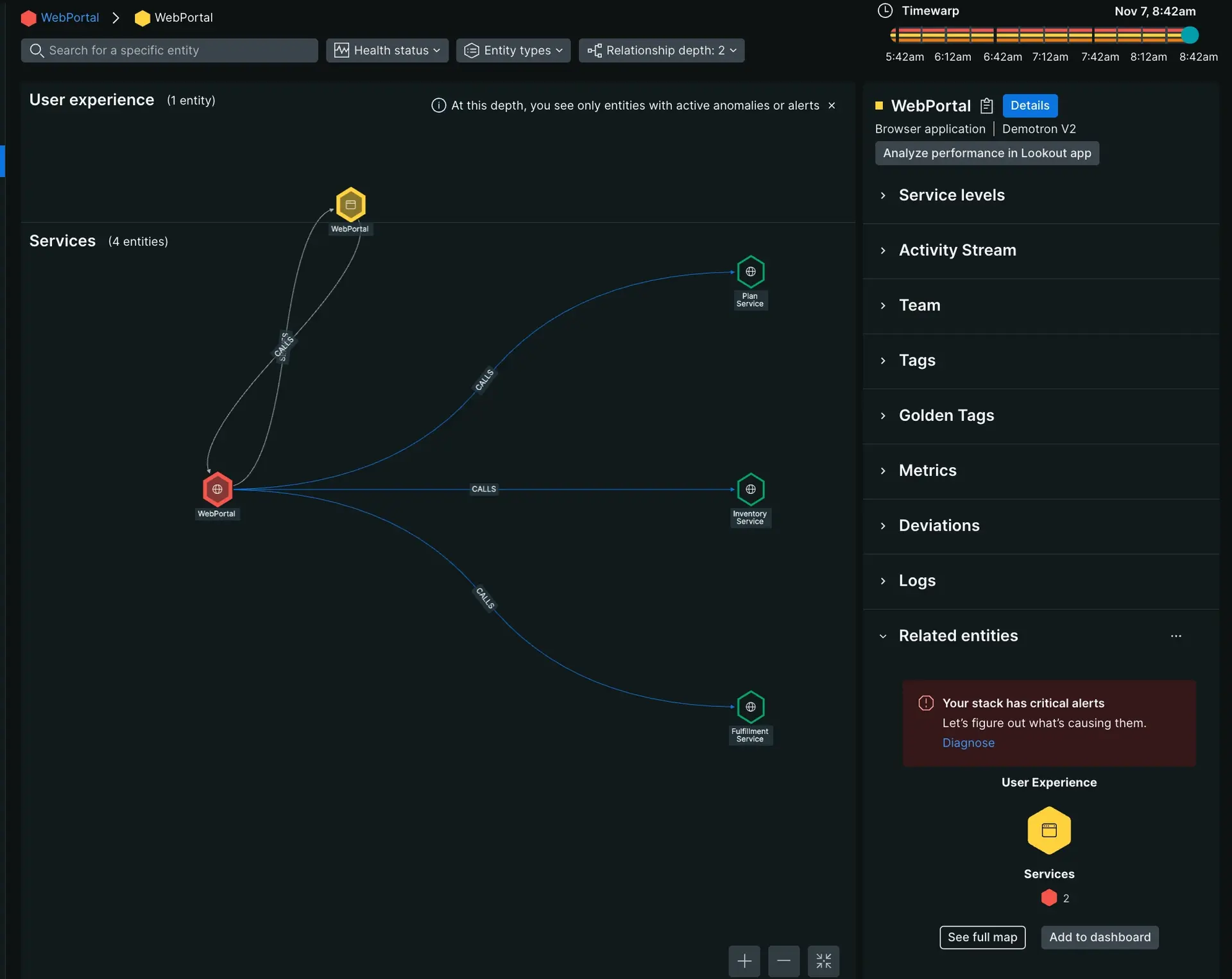 Passez votre curseur sur une entité et cliquez sur Map from this entity pour voir comment les entités sont liées du point de vue de cette entité. La carte des services sera mise à jour en conséquence.