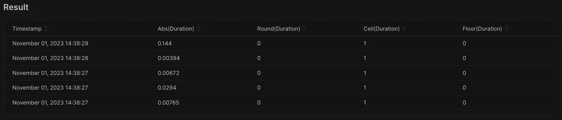SELECT abs(duration), round(duration), ceil(duration), floor(duration) FROM Transaction SINCE 1 day ago