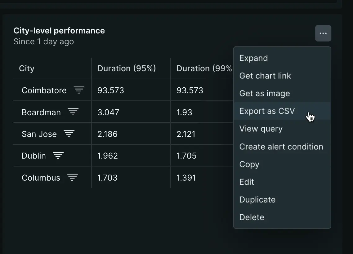Pour exporter un graphique de tableau de dashboard sous forme de fichier CSV, dans le coin supérieur droit du graphique, cliquez sur ... et sélectionnez Export as CSV.