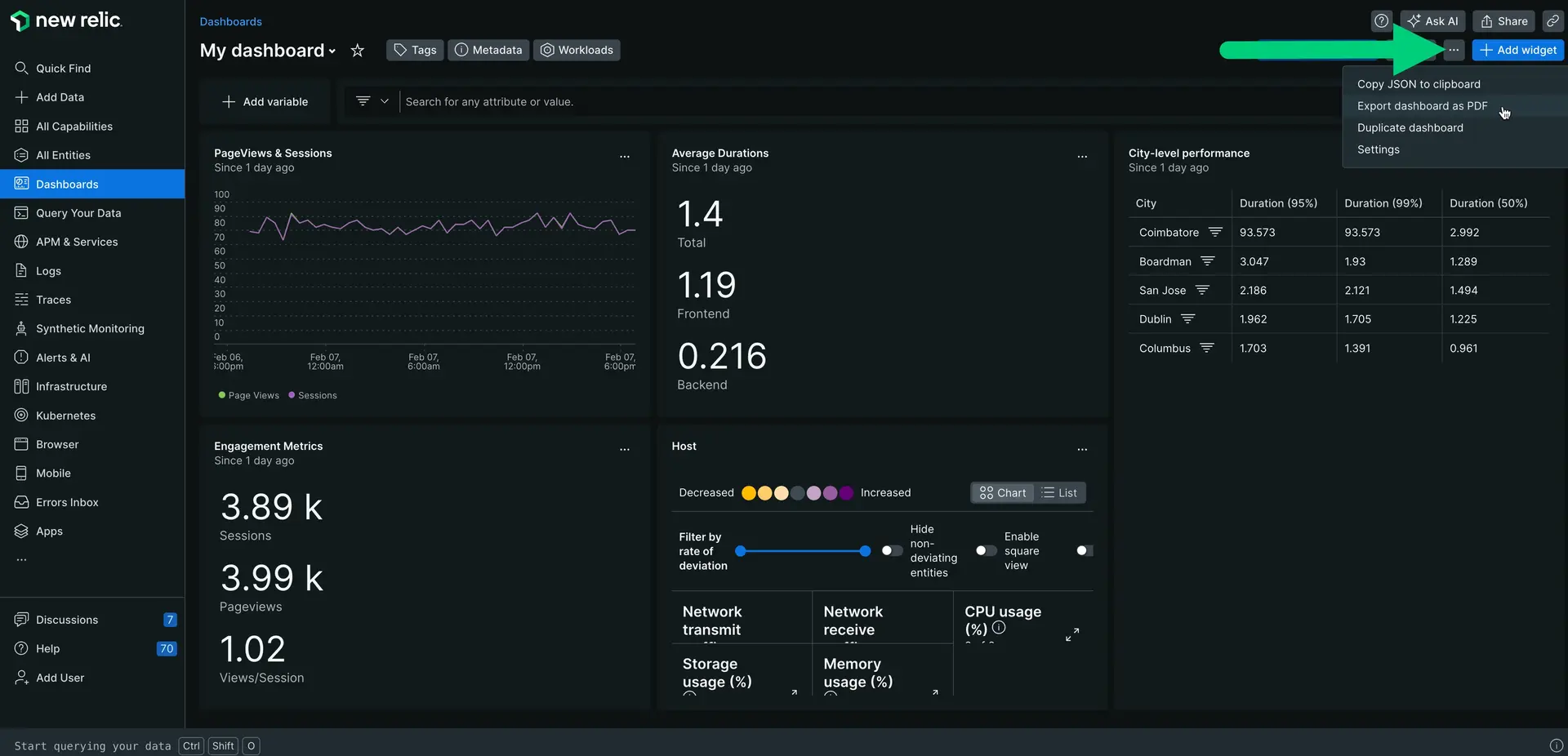 Accédez à one.newrelic.com > All capabilities > Dashboards et ouvrez un dashboard existant.