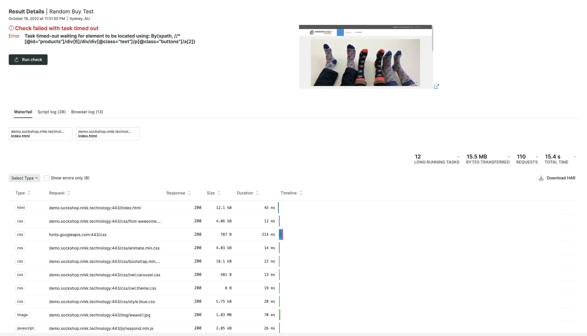 monitoring synthétique enregistre automatiquement chaque vérification simple et scriptée, vous permettant de voir le temps de chargement et la taille de la réponse pour chaque exécution, ainsi que l'ordre exact dans lequel chaque ressource a été chargée.