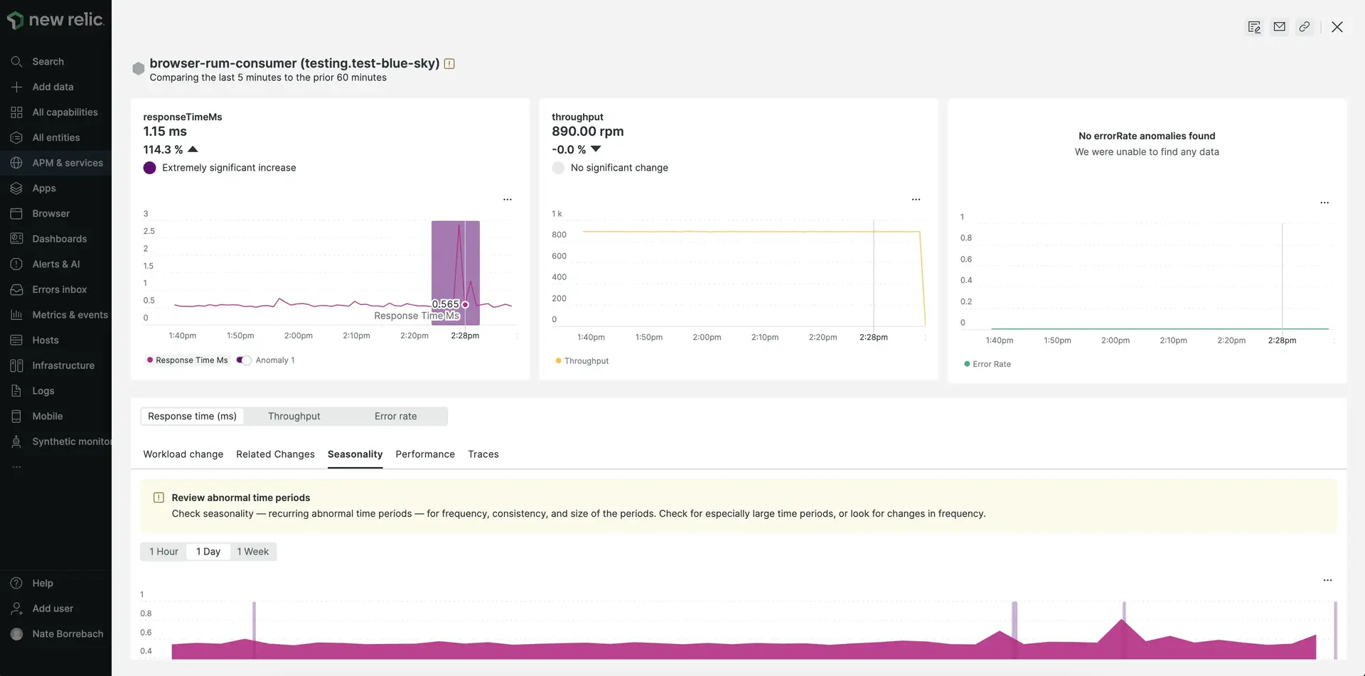 Use New Relic Lookout to detect deviations in your APM service entities' three golden signals (response time, error rate, and throughput) and analyze the behavior and causes of those deviations.