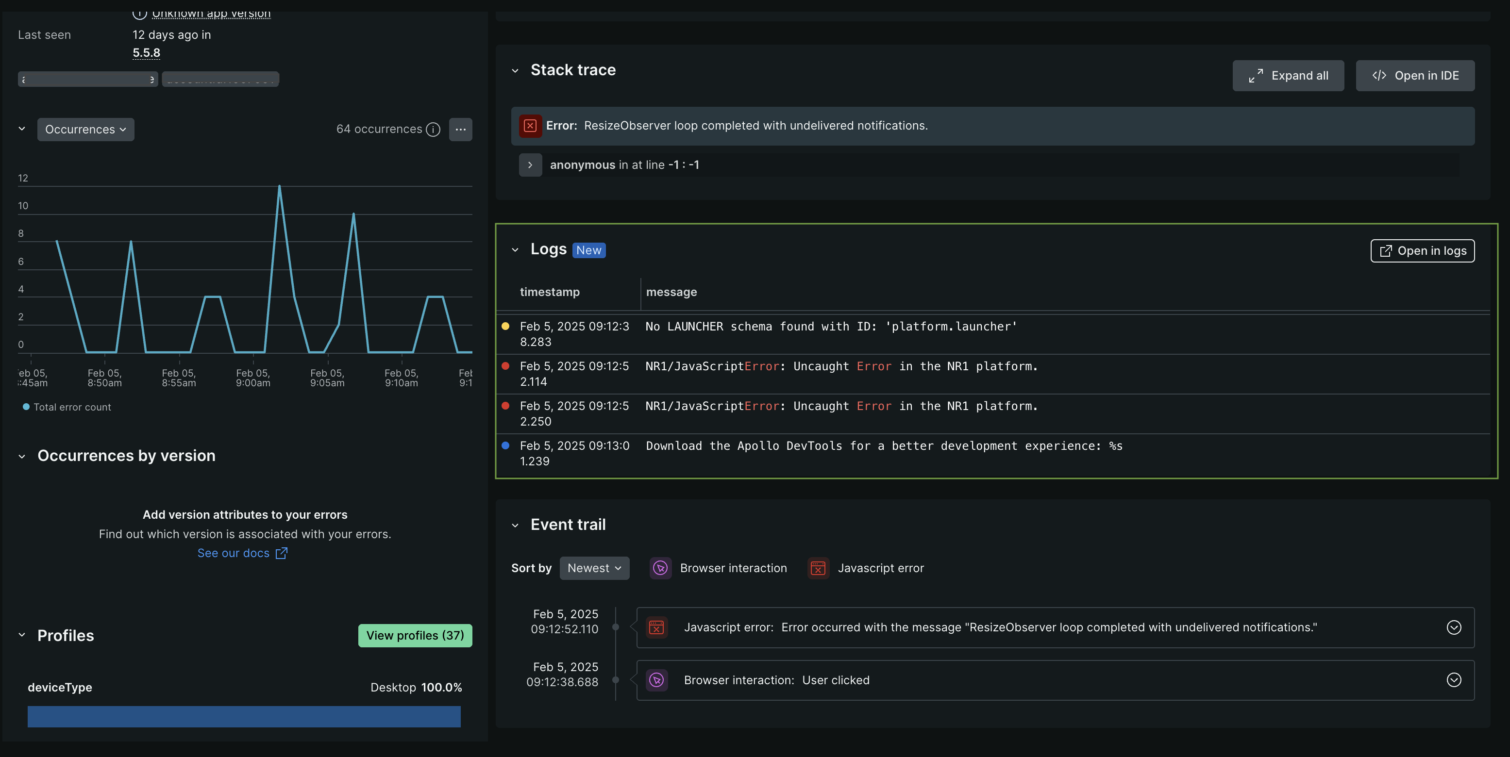 View browser logs alongside JavaScript errors during troubleshooting. This contextual information facilitates faster debugging and more effective root cause analysis, enabling you to resolve issues efficiently.