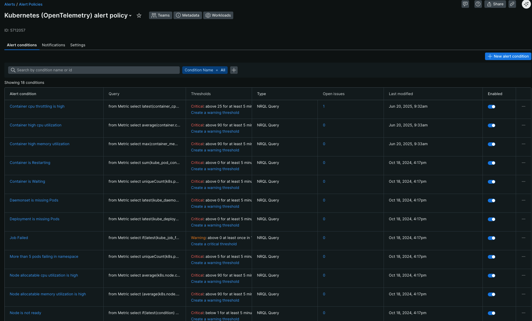 You can install essential alert policies by going through the guided installation flow in Integrations & Agents. This automatically sets up alert policy named Kubernetes (OpenTelemetry) alert policy in your New Relic account with multiple alert conditions designed for Kubernetes observability. Customize these conditions to suit your specific monitoring needs.