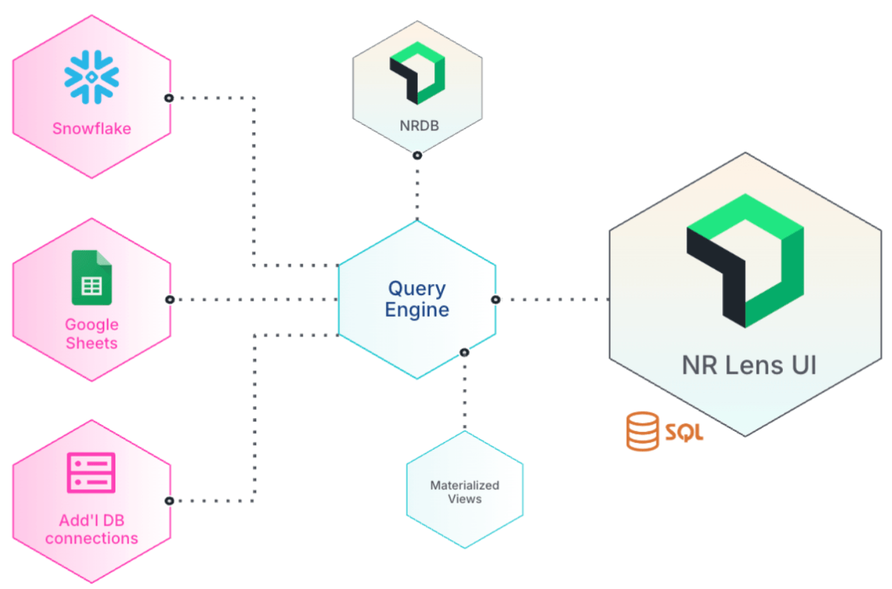 New Relic Lens addresses these challenges. Lens is a unified query platform within New Relic that lets you connect and query multiple data sources directly from New Relic. Write a query in Lens using ANSI SQL and perform cross-database joins to analyze and correlate data from various sources. Lens pushes computational work to each data source, which processes its portion of the query and returns only the results. Lens then combines these results, minimizing data transfer and maintaining security by never ingesting raw data from your external sources.