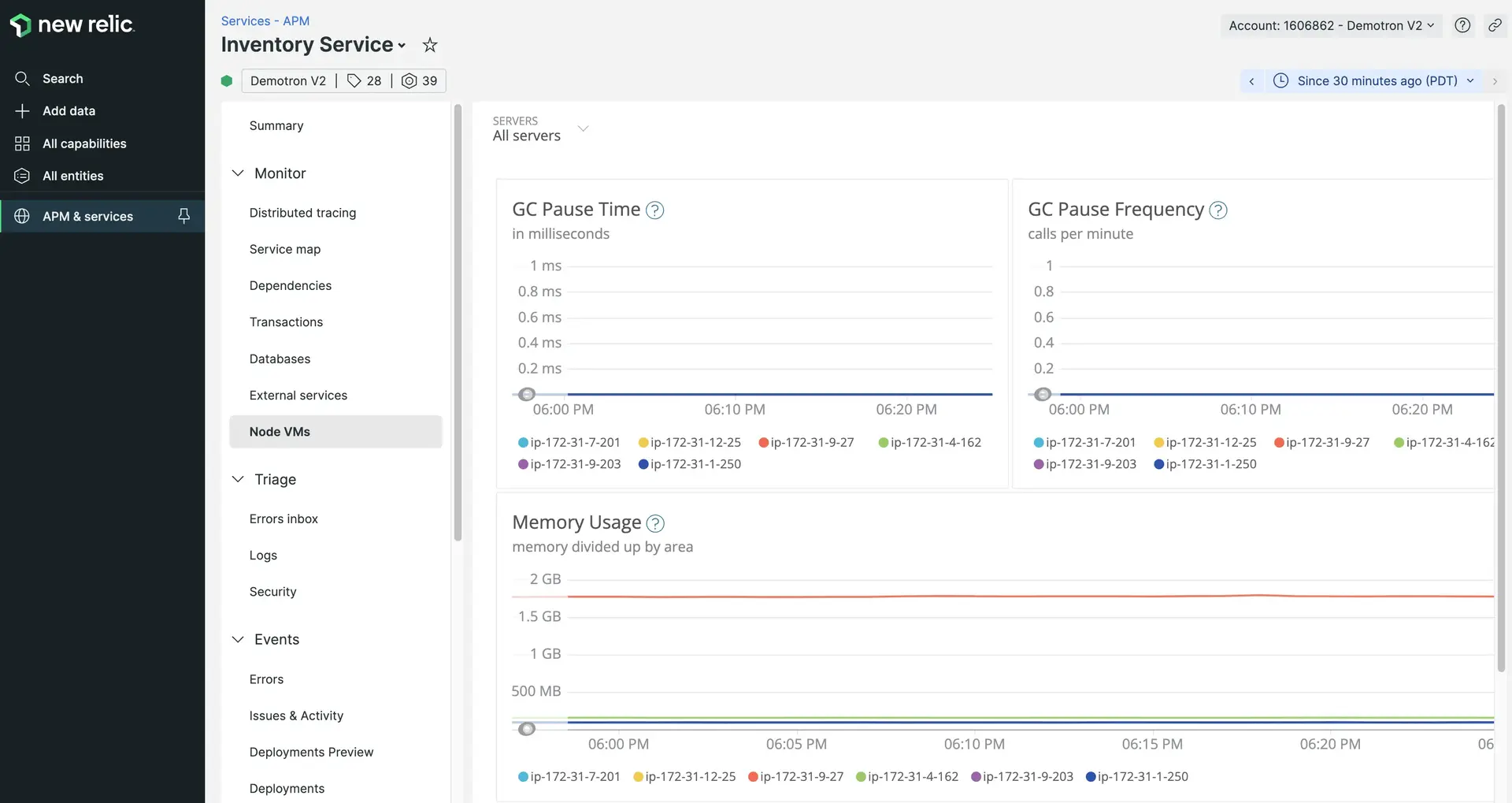one.newrelic.com > All capabilities > APM & services > (select an app) > Node VMs: When multiple servers are reporting to the same application, the page breaks charts down by server. You can view data for an individual server and obtain additional details by selecting a server from the Servers filter at the top of the page.
