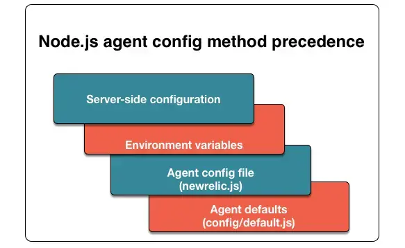 Node.js configuration hierarchy: Server-side configuration settings override environment variables. Environment variables override the agent config file. The config file overrides the agent defaults.